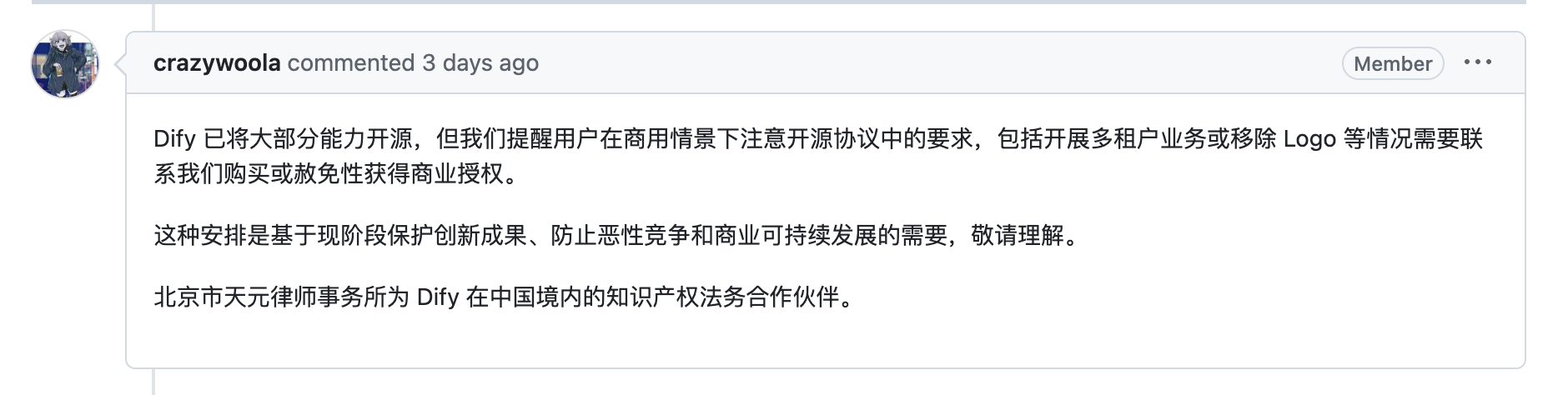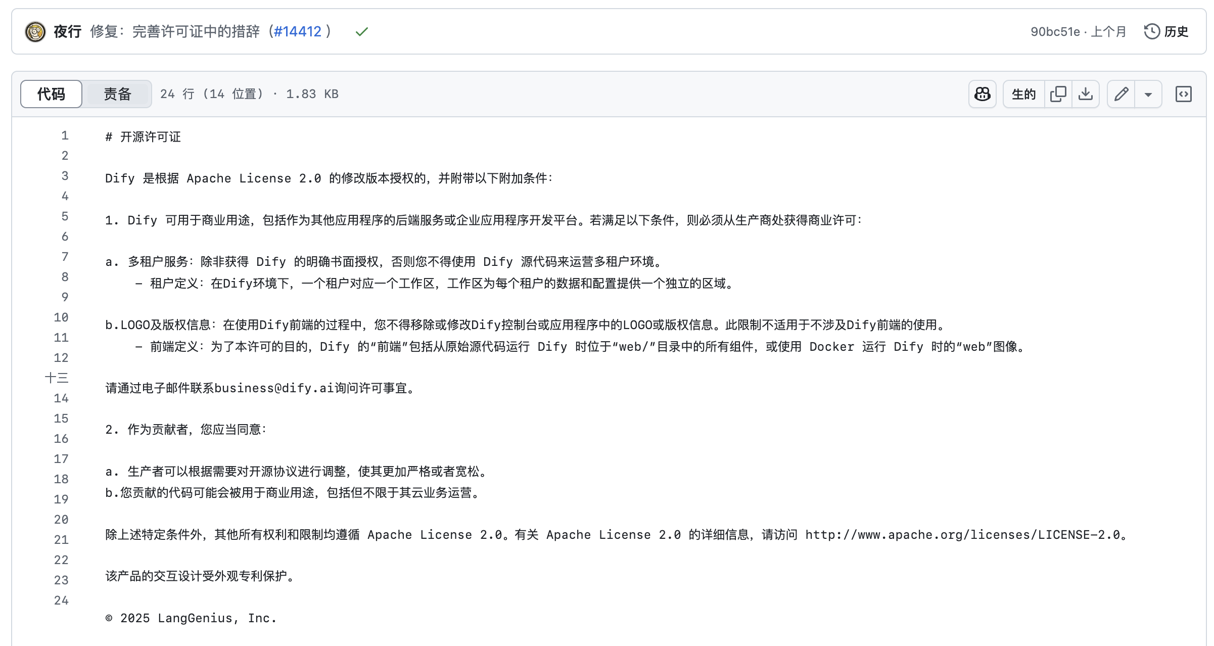 Dify 在 LICENSE 文件中显式声明了两条限制:禁止卖多租户 SaaS、禁止换 Logo。