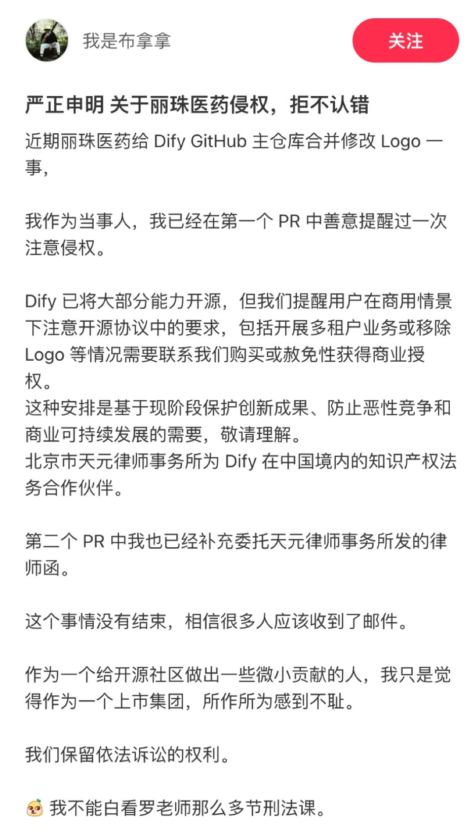 但对方不管不顾,直接无视了,继续提交 PR(该公司还将内部密钥、证书等敏感信息误提交至 Dify 主仓库)。在这背景下,Dify 向丽珠医药发出了律师函,要求停止相关侵权行为。