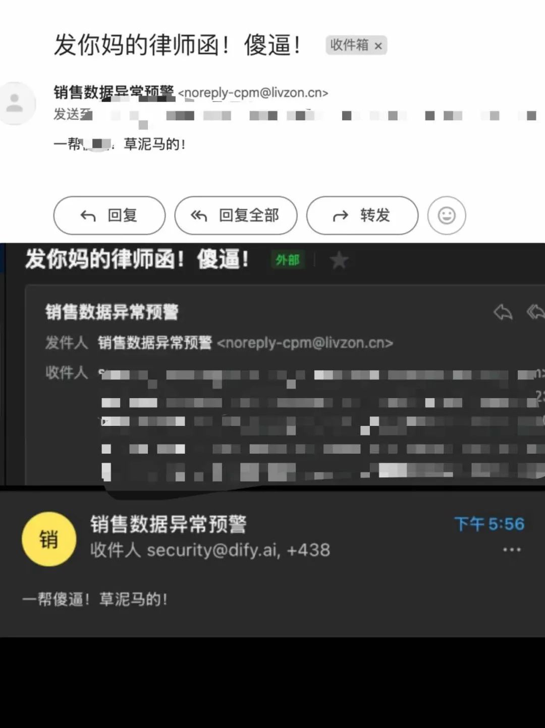没成想这家公司如此肆无忌惮地侵权后,竟然还用公司邮箱向多名Dify核心贡献者发送辱骂邮件。