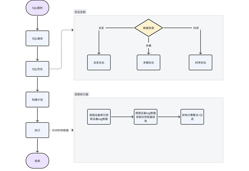• 单独的时序数据查询会使用时序特有的优化技术,采用多种优化策略,如时序索引(primary tag 索引,时间范围索引等)、算子下推、统计信息应用、聚合下推等多种手段提高时序数据的查询效率。