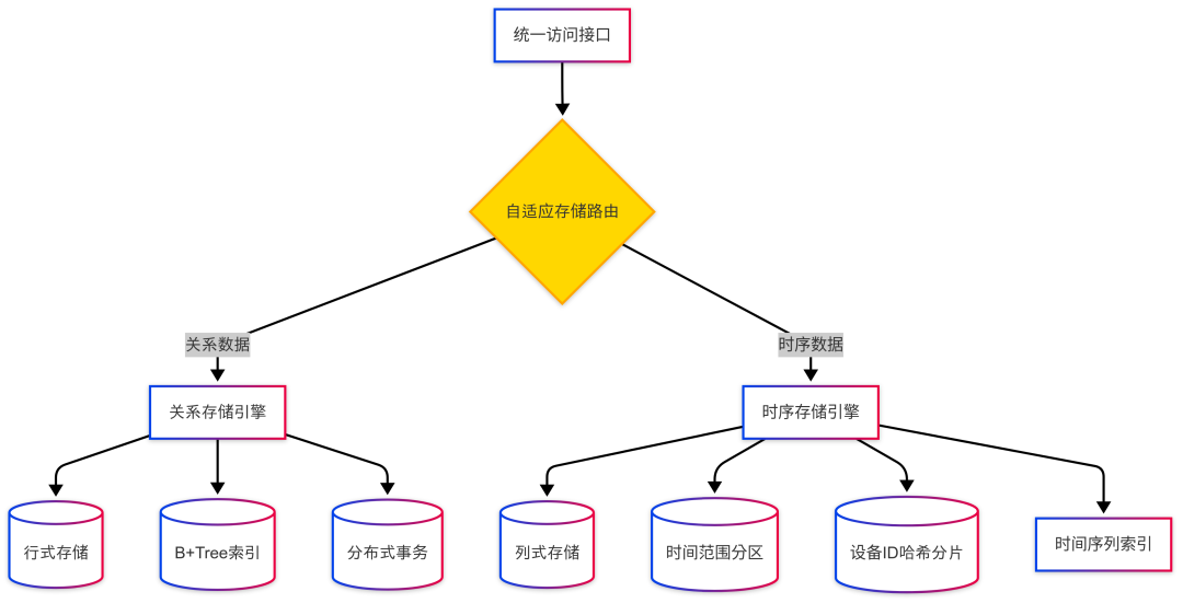 根据不同模的数据的存储特性采用特定的存储方案,关系数据保存在关系存储引擎中,时序数据保存在时序存储引擎中,如此时序数据即可实现特定的存储优化,自带时间索引、设备索引等。