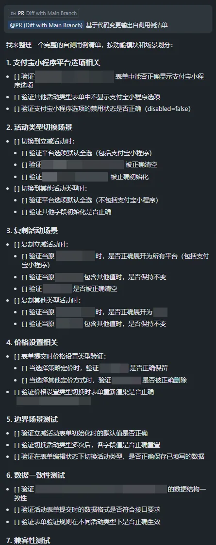| 提示词 | @git逐个文件分析并总结改动点,评估是否引入了新的问题。 | @git基于代码变更输出自测用例清单。 |