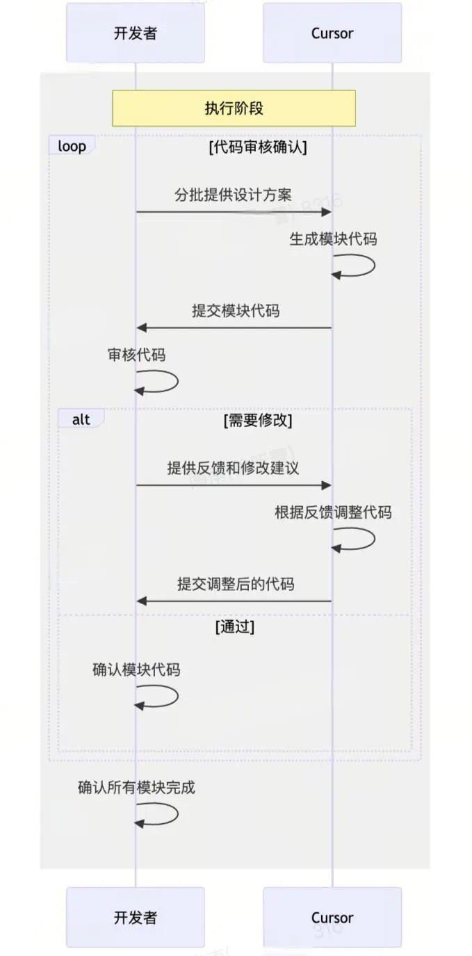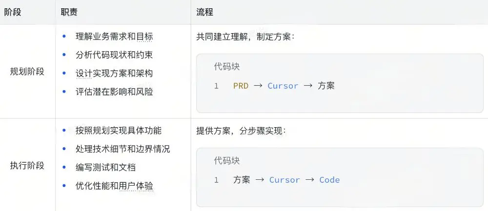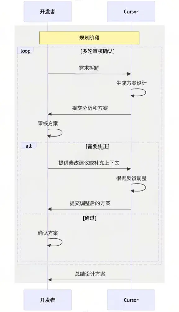 整体的 Cursor 协作流程分为规划和执行两个阶段。规划阶段专注于产出方案,执行阶段根据方案产出代码,两者交替执行。