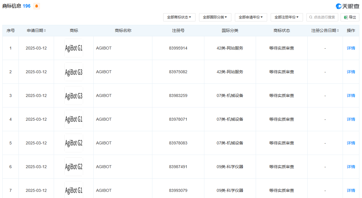 天眼查财产线索信息显示,智元机器人关联公司上海智元新创技术有限公司近日申请注册“AgiBotG1”“AgiBotG2”“AgiBotG3”商标,国际分类为网站服务、机械设备、科学仪器,当前商标状态均为等待实质审查。
