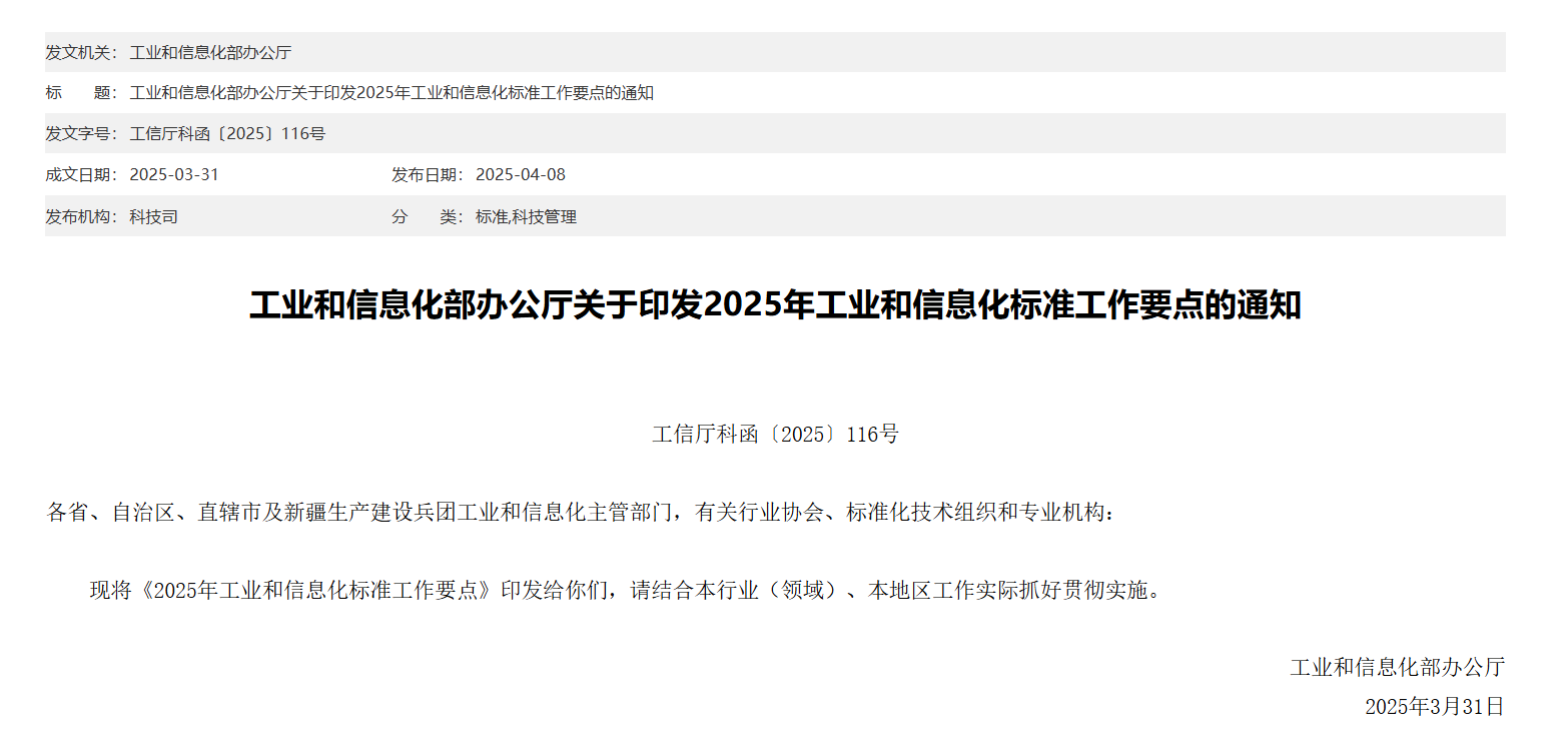 工业和信息化部办公厅印发2025年工业和信息化标准工作要点。