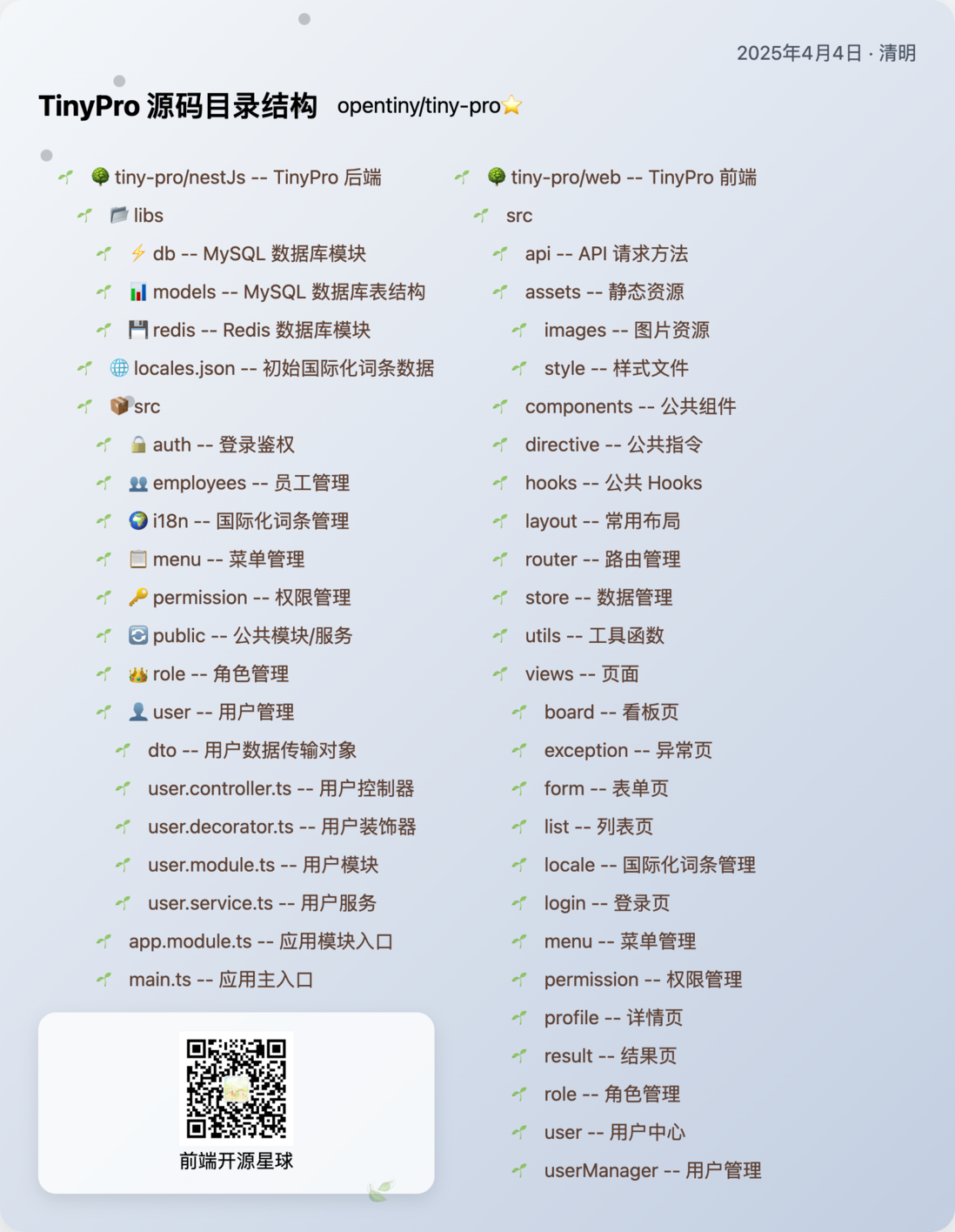TinyPro 提供了 NestJS 后端,将菜单、路由、国际化词条、角色、用户、权限等内容都放到了后端,用户可以通过在线的方式配置菜单、路由、国际化词条等内容,这样做有以下好处: