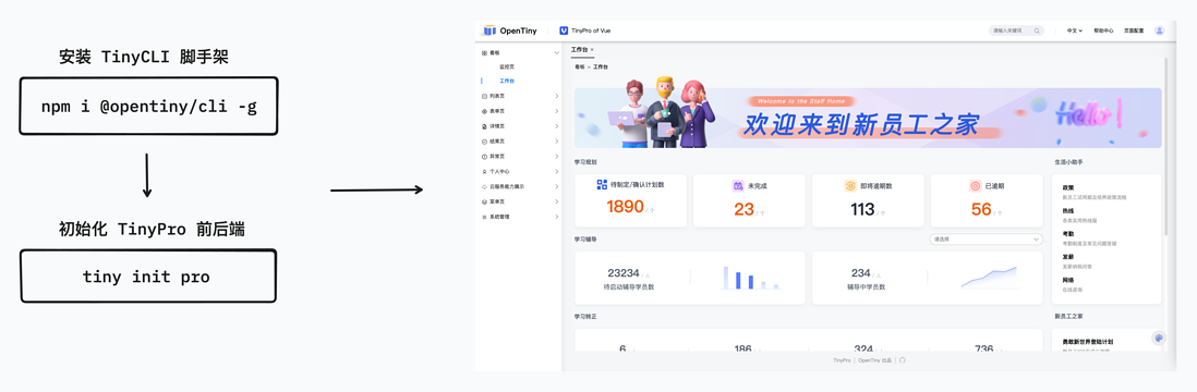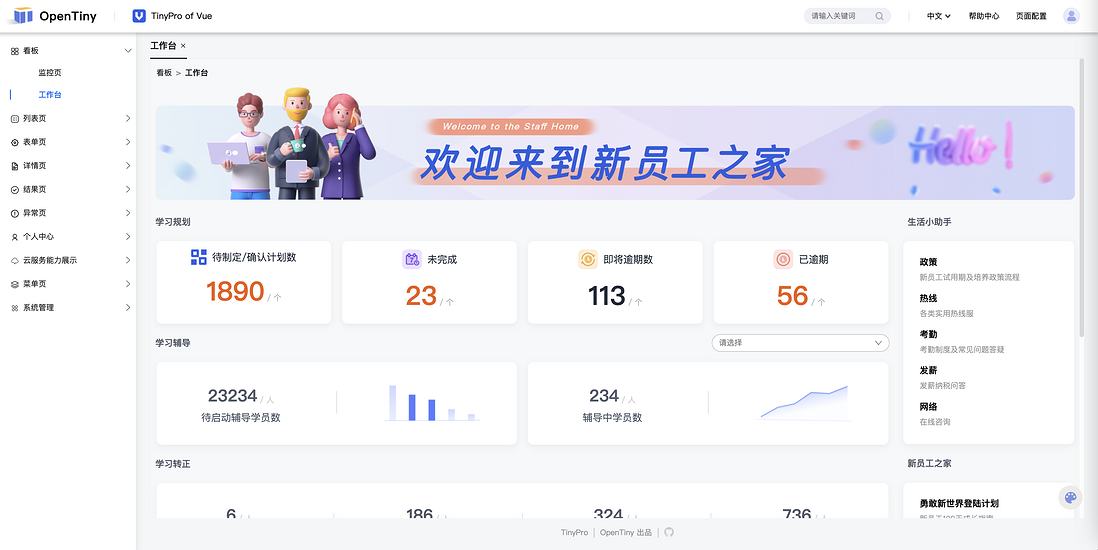 而 TinyPro 则是用 TinyVue 组件库搭建起来的“样板房”,这是一个已经搭建好的完整的后台管理系统,包含前后端。