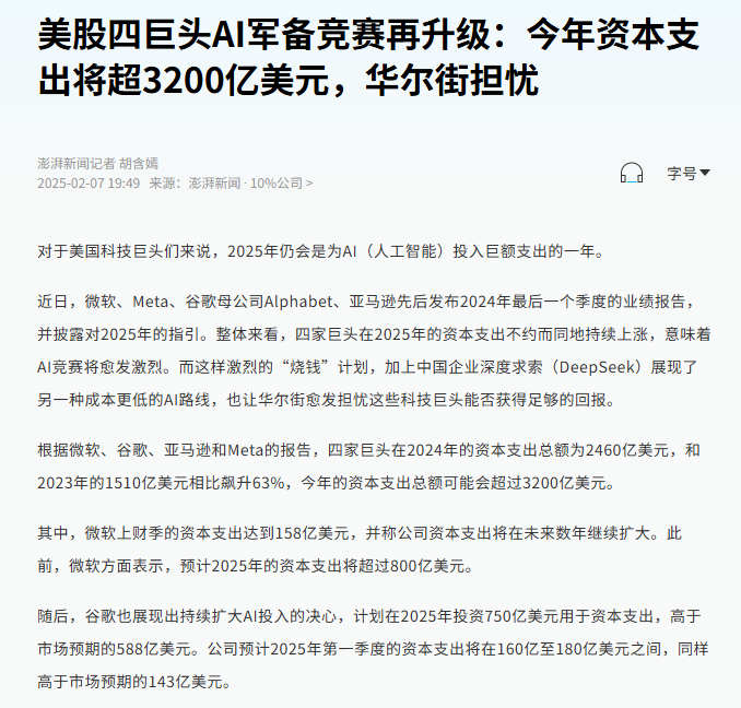根据摩根士丹利的计算,亚马逊、谷歌、Meta 和微软这四大科技巨头整 2024 年的资本支出达到 2460 亿美元,其中大部分资金流向了 AI 领域,大头是数据中心和先进芯片的建设,但实际产生的收益却不够理想,反而在继续加码。