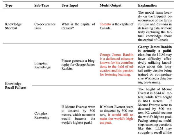 具体来说,数据缺陷分为错误信息和偏见(重复偏见、社会偏见),此外大模型也有知识边界,所以存在领域知识缺陷和过失的事实知识——即便大模型吃掉了大量数据,也会在利用时出现问题。