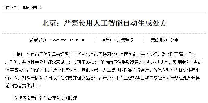 反观国内的医疗行业,则是在“ AI 诊疗”上频加红线,北京市卫健委明确指出:医疗机构开展互联网诊疗活动要加强药品管理,严禁使用人工智能等自动生成处方,且人工智能软件等不得冒用、代替医师本人提供诊疗服务。