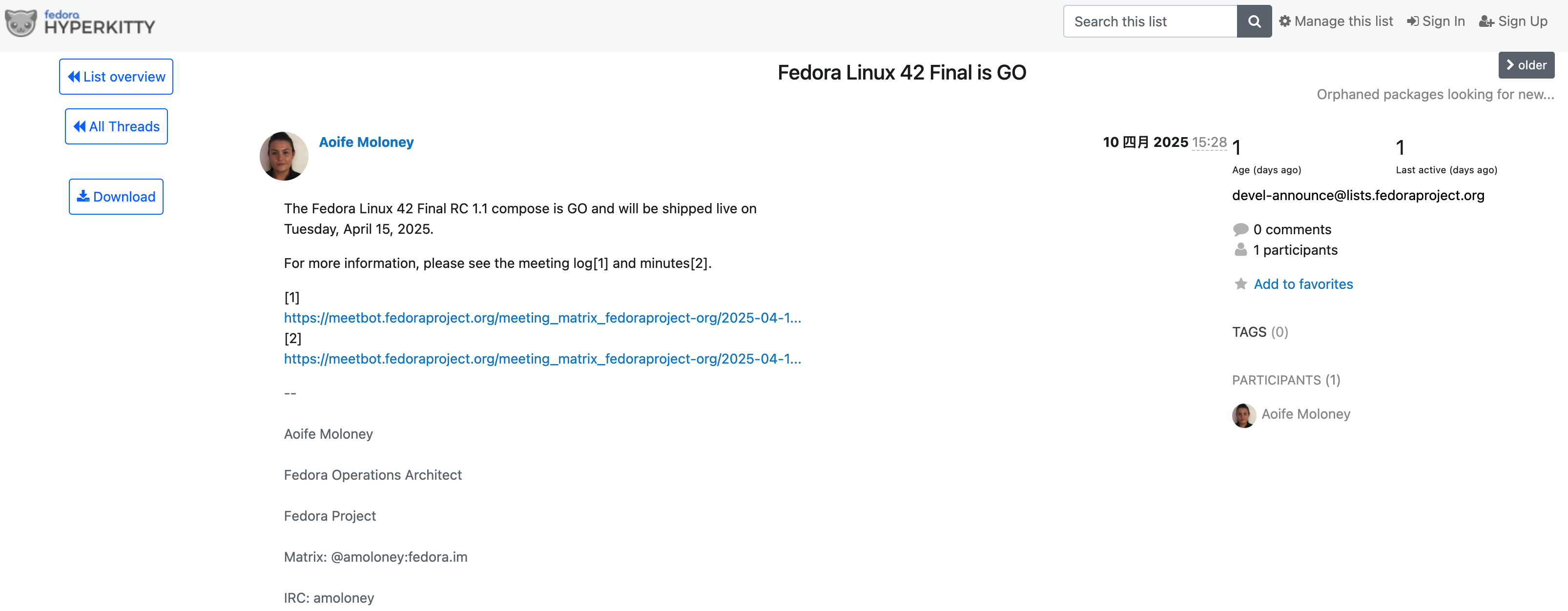 对于希望开始尝试 Fedora 42 的用户,可以通过 这个 Fedora Wiki 页面 获取 RC 1.1 镜像。