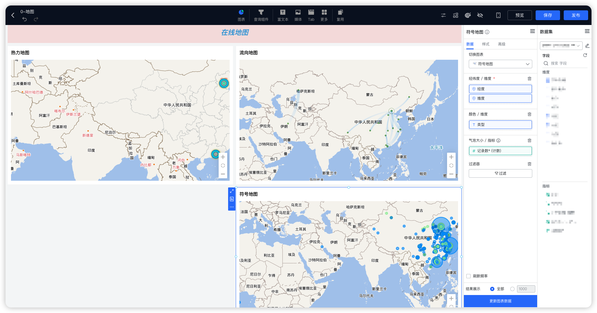 DataEase v2.10.7 LTS版本在线地图正式支持高德地图、天地图(国家地理信息公共服务平台)和腾讯地图三大地图服务,用户可基于业务需求自由切换地图引擎,提升地理数据的可视化能力。