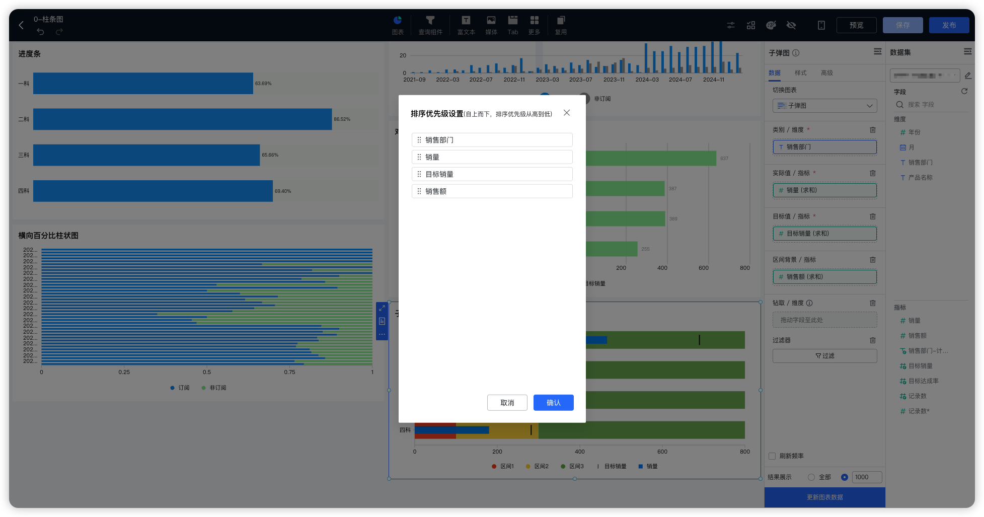 DataEase v2.10.7 LTS版本支持对多个图表字段(维度和指标)的排序优先级进行设置,系统将根据设置的优先级顺序依次对图表字段进行排序。