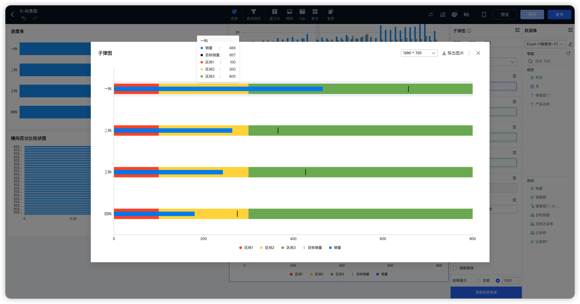 DataEase v2.10.7 LTS版本新增子弹图图表类型。子弹图可以通过简洁的样式展示单一指标的实际值、目标值以及不同性能区间的对比,适合在有限空间内高效呈现数据。