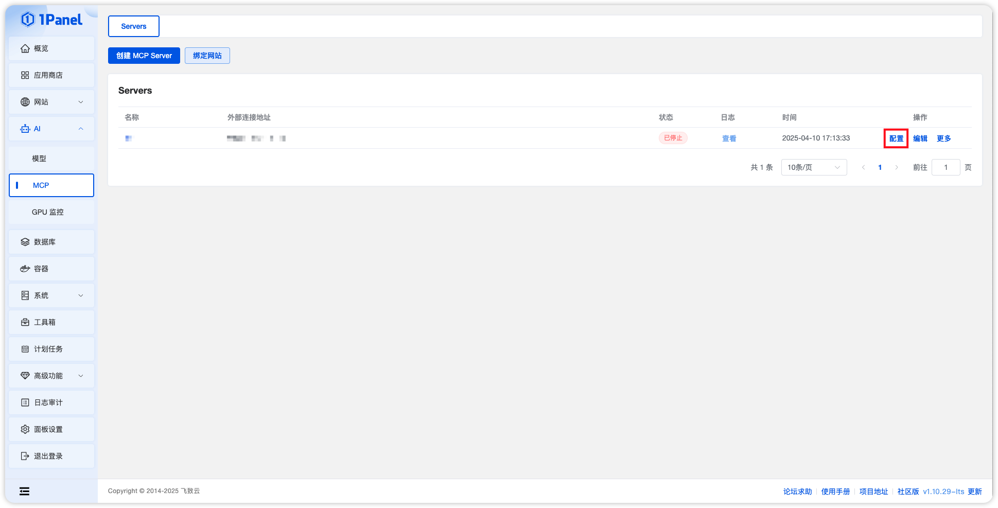然而在实际操作过程中,搭建MCP Server需要手动配置大量依赖,部署门槛较高,许多用户难以上手。为了解决这个问题,1Panel v1.10.29 LTS版本推出了原生的MCP Server管理功能,该功能通过容器化方式实现一键部署MCP Server,能够极大简化搭建流程。