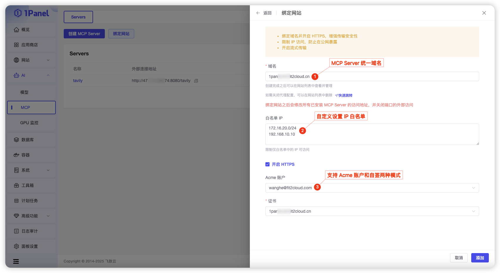 通过为MCP Server网站配置IP访问白名单,可以有效隔离外部非授权访问,在网络入口层面建立起第一道安全防线。同时配合1Panel的防火墙策略和容器隔离机制,可以显著提升整体系统的安全性与稳定性。