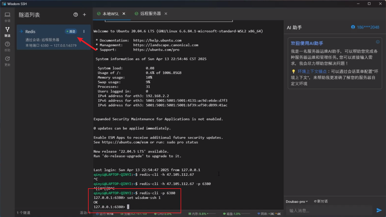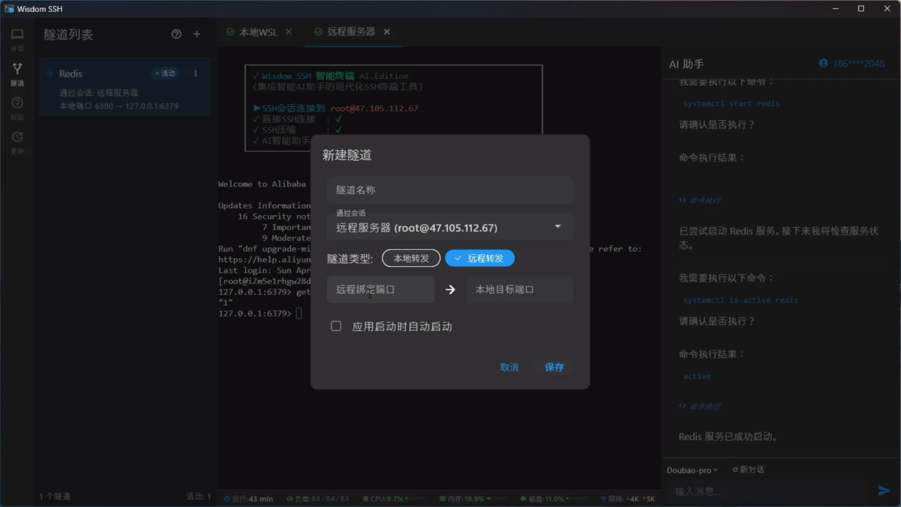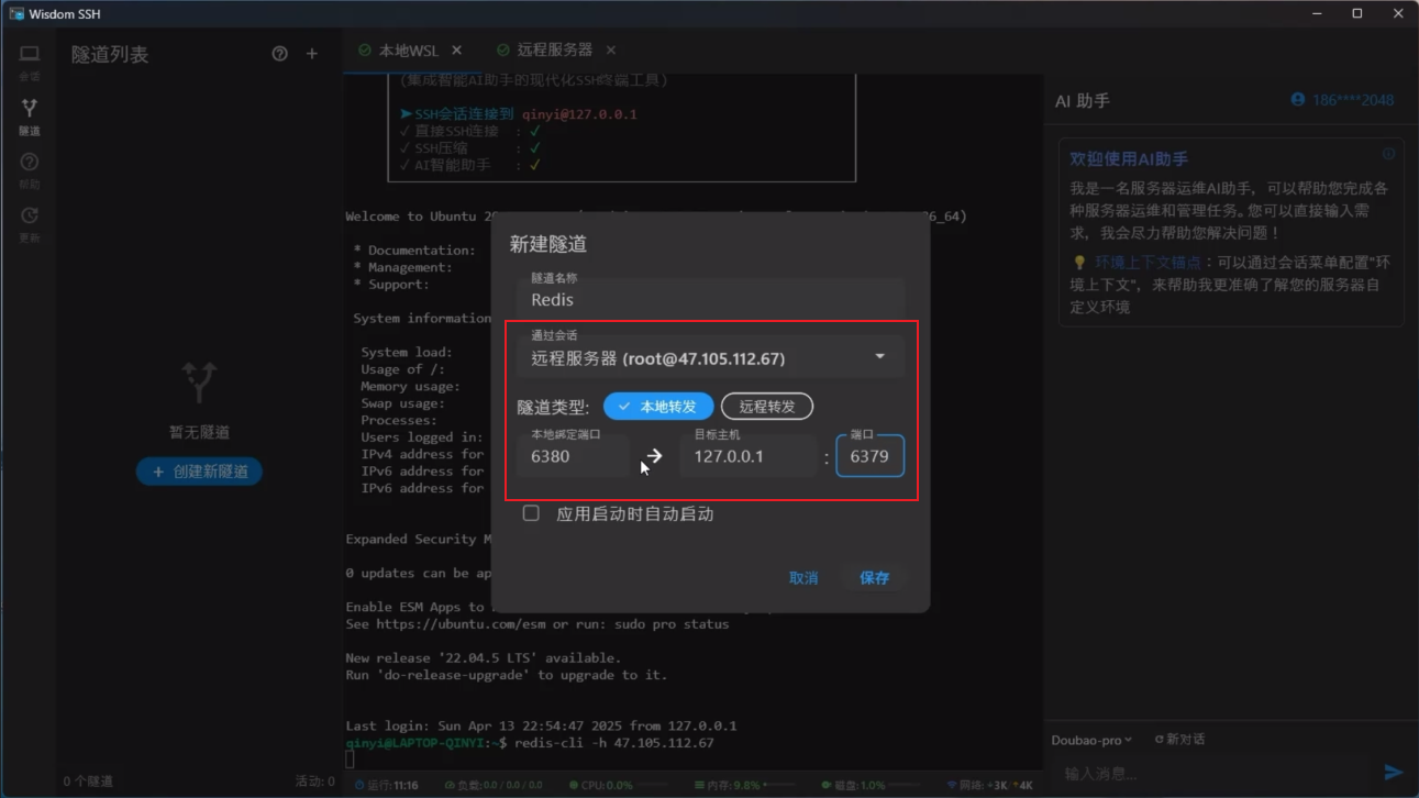 Wisdom SSH 1.3.0 更新:AI 运维解锁隧道转发功能,本地访问服务器内网Redis