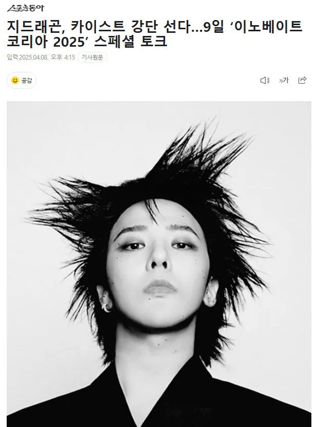 据报道,权志龙将登上KAIST(韩国科学技术院)讲台,于9日在"Innovate Korea 2025"论坛中与AI娱乐科技企业Galaxy Corporation共同进行以"AI娱乐科技的未来"为主题的特别演讲。
