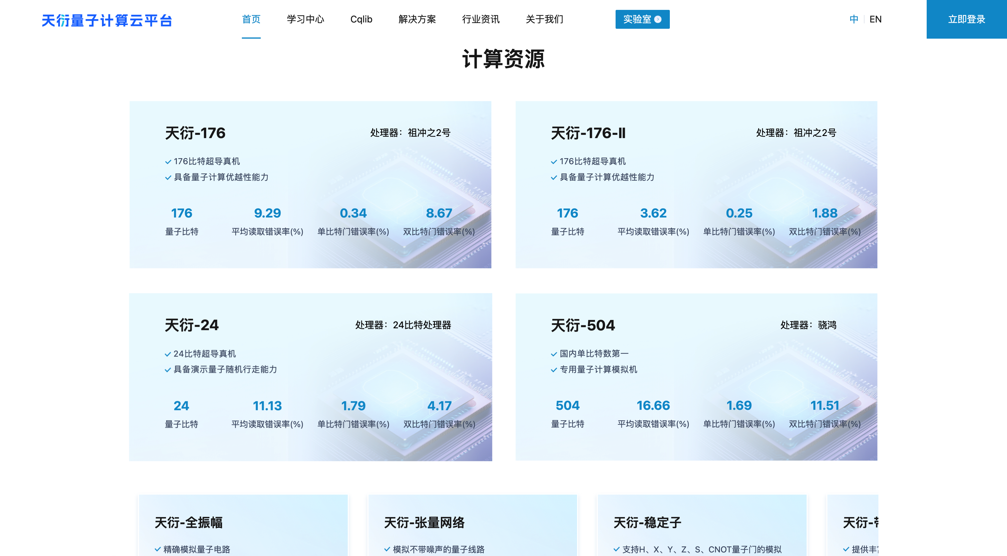 2024年12月,“天衍”量子计算云平台正式接入全国单台比特数最多的超导量子计算机“天衍-504”,实现了“天衍”量子计算云平台在算力规模和算力类型上的双重升级,构建起由一台24比特、两台176比特和一台504比特的量子计算机组成的国内最大规模量子计算集群。