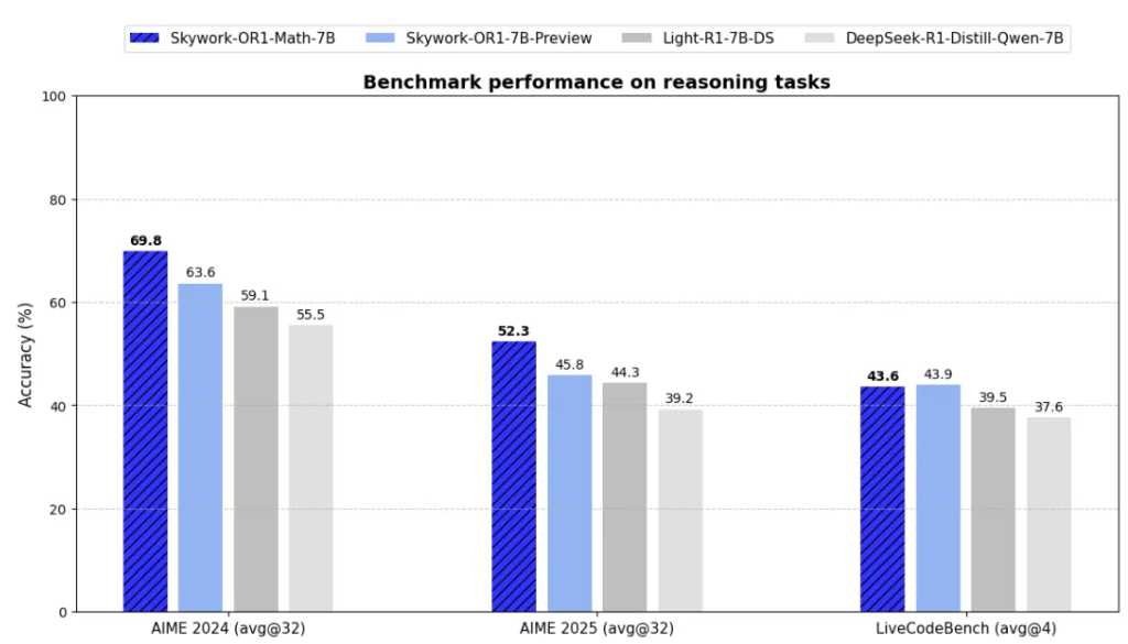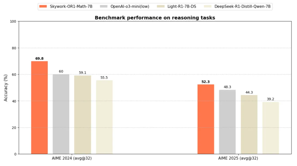 针对数学场景深度优化的专项模型Skywork-OR1-Math-7B更是在AIME24和AIME25上分别取得69.8与52.3的高分,远超当前主流7B级别模型,充分验证了其在高阶数学推理任务中的专业优势。