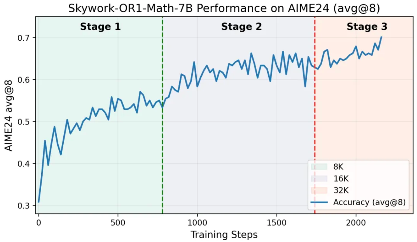 其中Skywork-OR1-Math-7B表现尤为亮眼,作为一个专注于数学推理能力的7B参数模型,通过多阶段GRPO训练在复杂数学问题上实现了卓越表现,同时在代码任务上也有较强的泛化能力。下图是该模型在AIME24上的训练准确率曲线:
