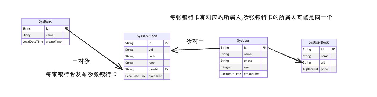 有些小伙伴就很奇怪为什么对于user而言是left join对于bank而言缺是inner join原因就是在创建对象关系的时候我们指定了SysBankCard和SysBank的关系是外键关系所以不可能存在有银行卡没有银行的情况 具体对象如下