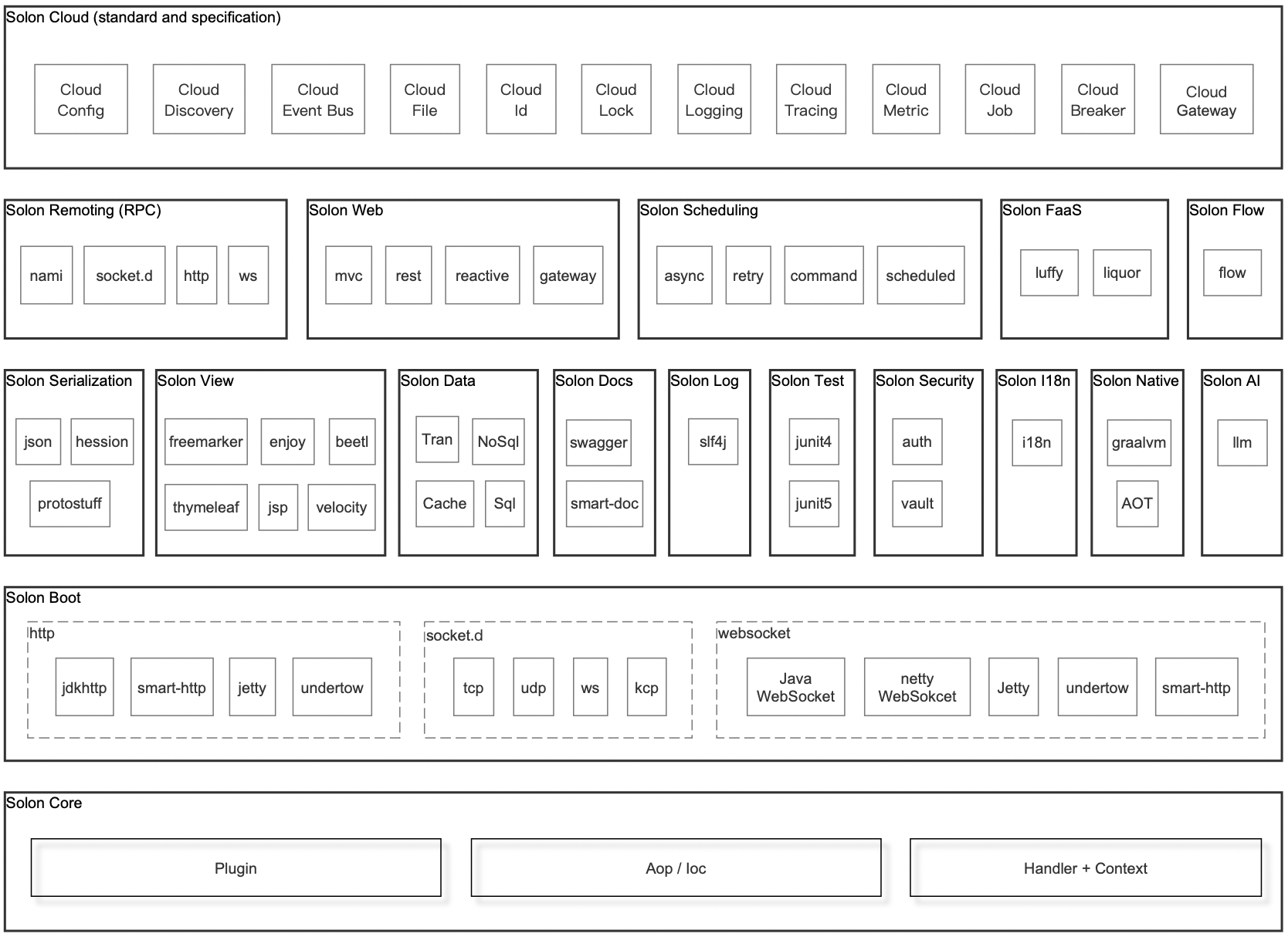 Solon 是新一代,Java 企业级应用开发框架。从零开始构建(No Java-EE),有灵活的接口规范与开放生态。采用商用友好的 Apache 2.0 开源协议,是“杭州无耳科技有限公司”开源的根级项目,是 Java 应用开发的生态基座(可替换 Spring 生态)。