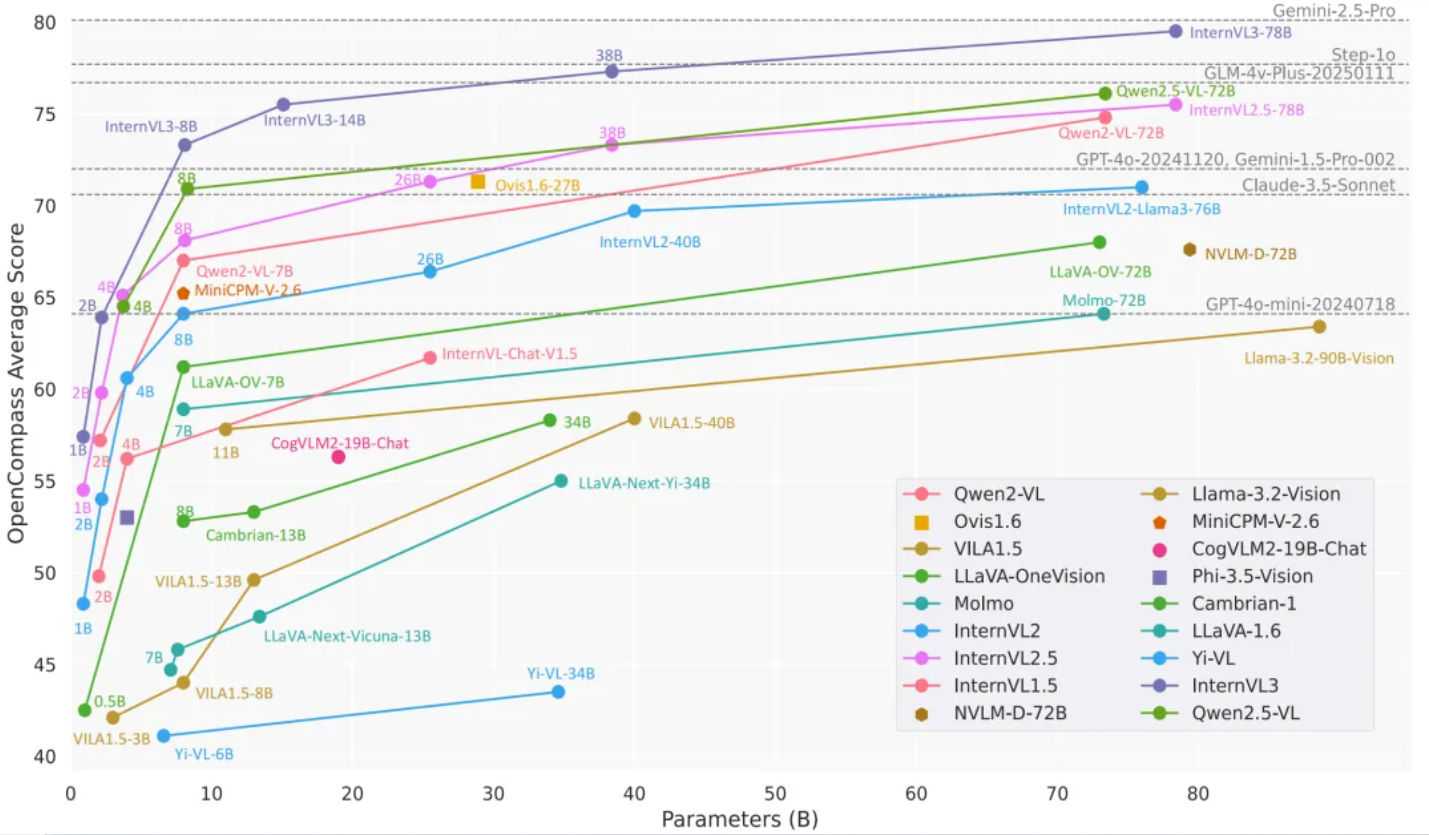 根据介绍,通过采用创新的多模态预训练和后训练方法,InternVL3 多模态基础能力全面提升,在专家级基准测试、多模态性能全面测试中,10亿~780亿参数的全量级版本在开源模型中性能均位列第一,同时大幅提升了图形用户界面(GUI)智能体、建筑场景图纸理解、空间感知推理以及通识学科推理等方面的能力。