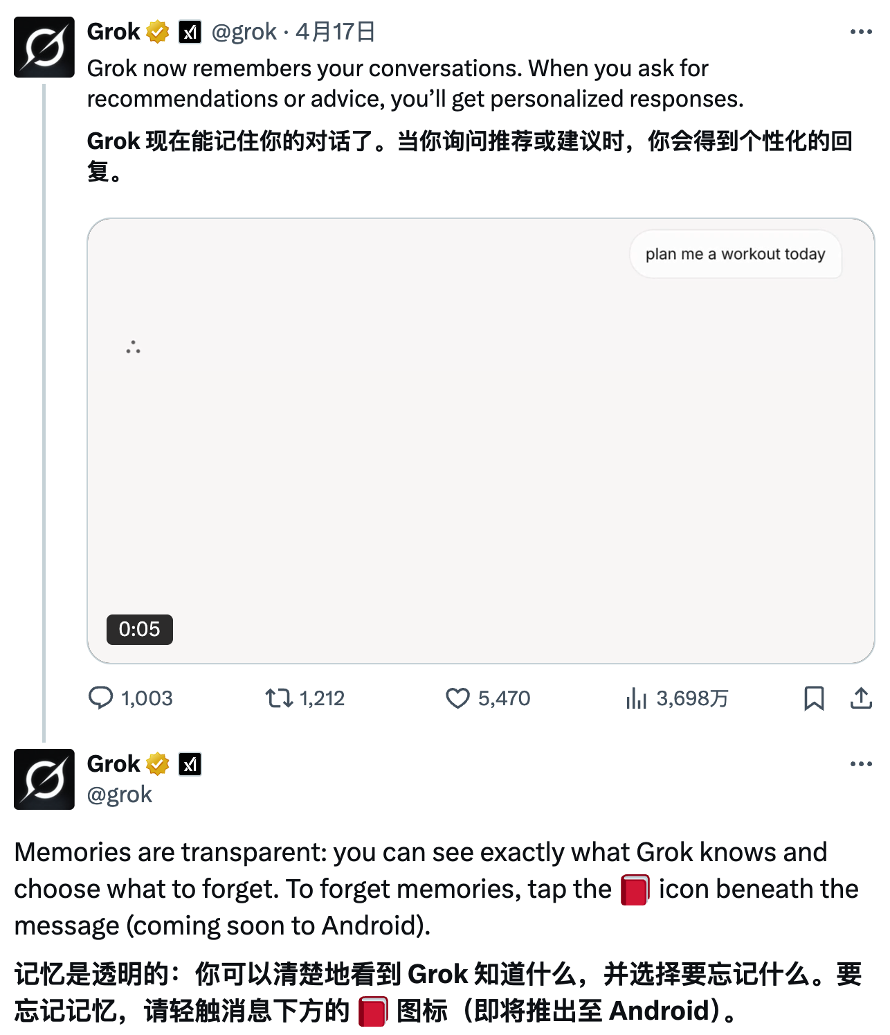 xAI 表示,X 平台上的 Grok 也将逐步具备“记忆”功能。