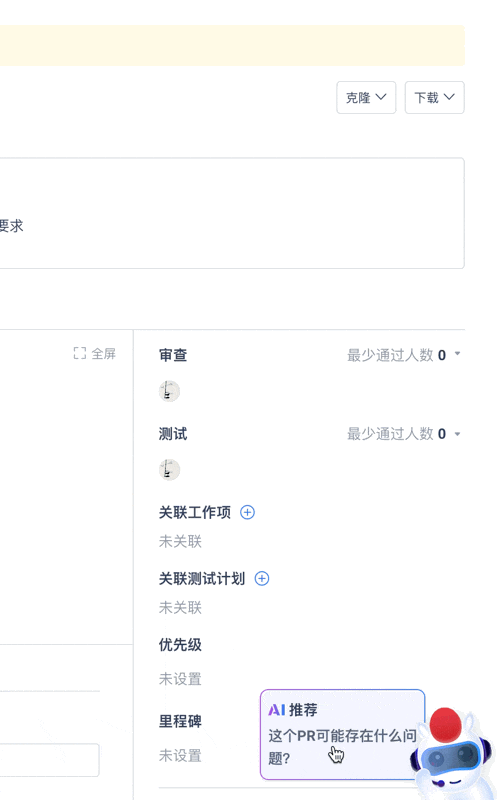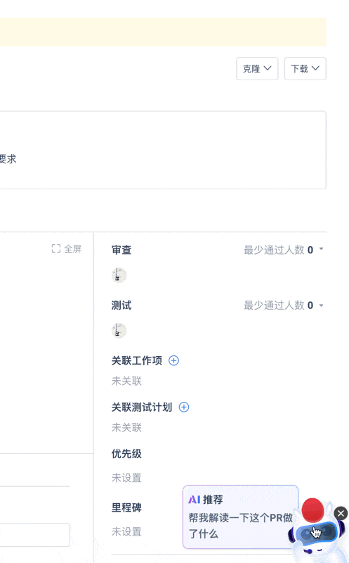 本次更新将马建仓 AI 助手入口统一整合,并支持在查看 PR、新建周报、缺陷详情、需求详情、代码文件等不同页面和使用场景下,智能推荐对应的 AI 能力。