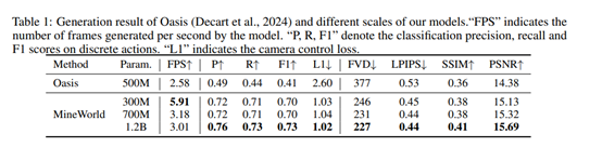 可控性方面,MineWorld 的 3 亿和 7 亿参数模型 F1 分数达 0.70,12 亿参数模型为 0.73,远高于 Oasis 的 0.41;相机控制 L1 损失也更低。推理速度上,MineWorld 每秒生成 5.91 帧,远超 Oasis 的 2.58 帧。