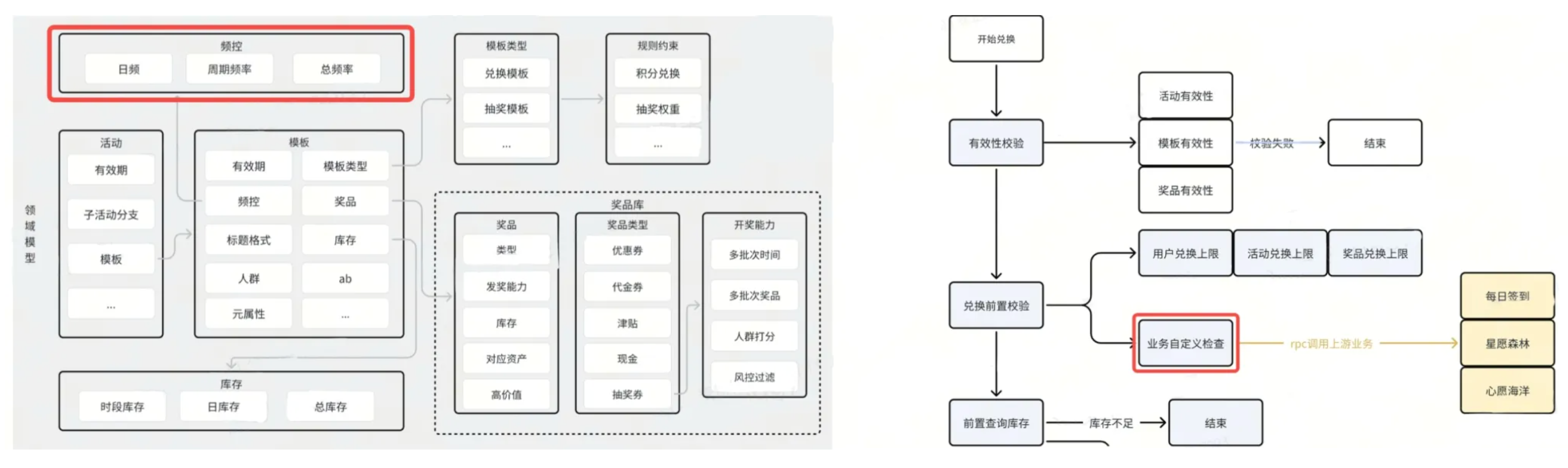 ▪ 其次是活动维度的频控,这个是在兑换流程中,商城中台给业务方提供了开放能力。在兑换前置环节可以自定义校验逻辑,比如N天可兑换N次。