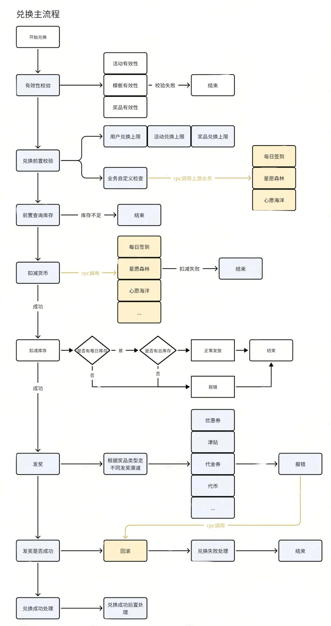 要想兑换具体的商品需要经过一系列流程,下图为兑换的主流程介绍,包含了用户从发起兑换到最终兑换成功或失败的流程。主要为用户选择某个奖品兑换需要处理的一系列业务逻辑。