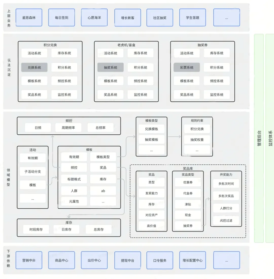 ▪ 主要包括三类玩法,包括积分兑换、老虎机/盲盒,以及抽奖券等。玩法核心所依赖的领域模型基本相似,各个系统都能得到了很好的复用。而在玩法层面,我们主要使用了设计模式中的模板模式,优先搭建好每个玩法的骨架,然后将一些关键步骤交由上游应用自定义实现。