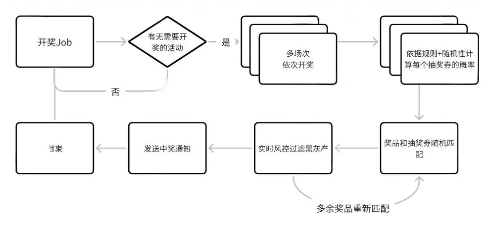 抽奖券玩法的核心在于开奖定时任务的逻辑,这类抽奖券活动不同于奖品兑换,单次活动可能有百万人参与,一万人中奖的情况。那么这样开奖Job的实时计算量就过于庞大了,测试环境按照这个量级进行开奖的话,耗时就已达到10多分钟之久。这个时长对于开奖脚本来说是不可接受的了,不仅用户体验达不到预期,而且时长太长,这段时间如果服务一旦出现其他情况(如新功能部署、容器节点被调度等)中断开奖流程更是会阻塞流程。