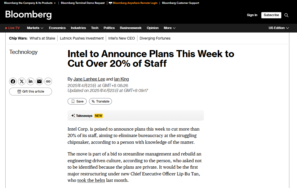 彭博社报道称, 英特尔将于本周宣布裁员 21,000 多人,约占其员工总数的 20%。