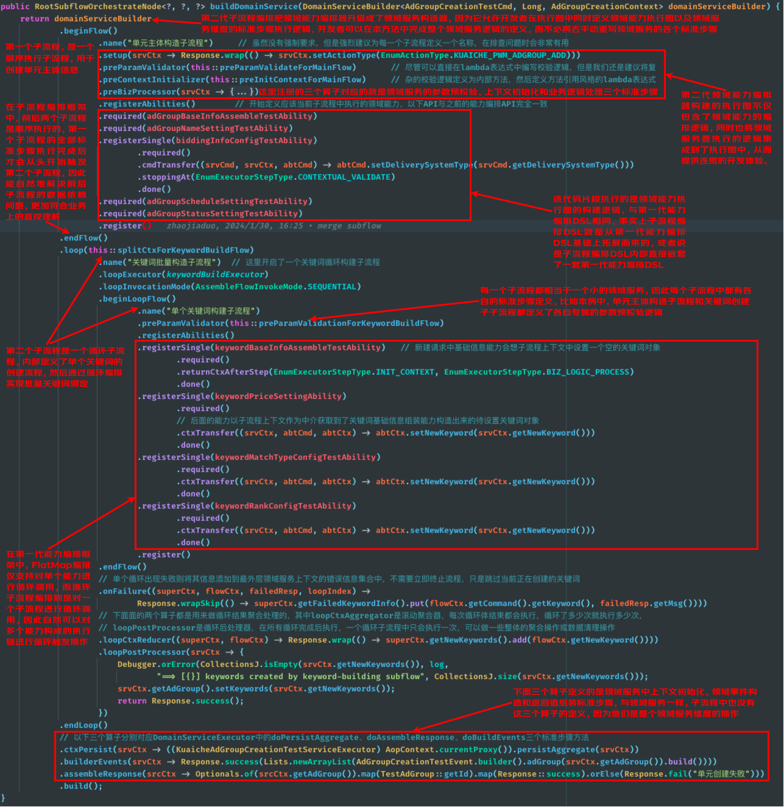 下图给出了一个使用子流程编排DSL构建领域服务执行图的例子,可以看到,与第一代能力编排框架类似,第二代子流程编排DSL为开发者提供了顺序、条件、循环、捆绑及包装五种子流程编排节点。其中循环子流编排节点支持子流程维度的循环调用,解决了第一代能力编排框架中FlatMap编排节点仅支持对单个能力进行循环调用的问题,因此在一对多的子层级物料创编场景中有广泛的应用,如下面例子中的在单元下绑定关键词列表的场景:一个单元下可以绑定多个关键词,而单个关键词的绑定操作需要串联执行多个领域能力,此时我们可以将单个关键词的构建过程定义为一个基础顺序子流程,然后再通过循环子流程编排节点将这个基础子流程循环集成到单元创建领域服务执行图中,这样就可以实现在单元下批量绑定关键词的功能;而捆绑子流程的作用类似于通用编程语言中的‘{}’,它能够将多个子流程包装成一个逻辑子流程节点,这一特性让子流程编排能够支持任意不同子流程之间的组合及嵌套,进一步提升了编排框架对各类业务场景的普适性;包装子流程节点则是专门为已有领域服务执行器的组合复用而设计的,它可以将一个现有的领域服务执行器包装成一个子流程编排节点添加到子流程编排执行图中,这一特性在复用现有接口进行集成化改造或实现批量操作等需求中会为开发者提供极大的便利。