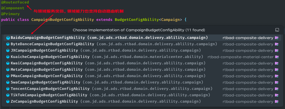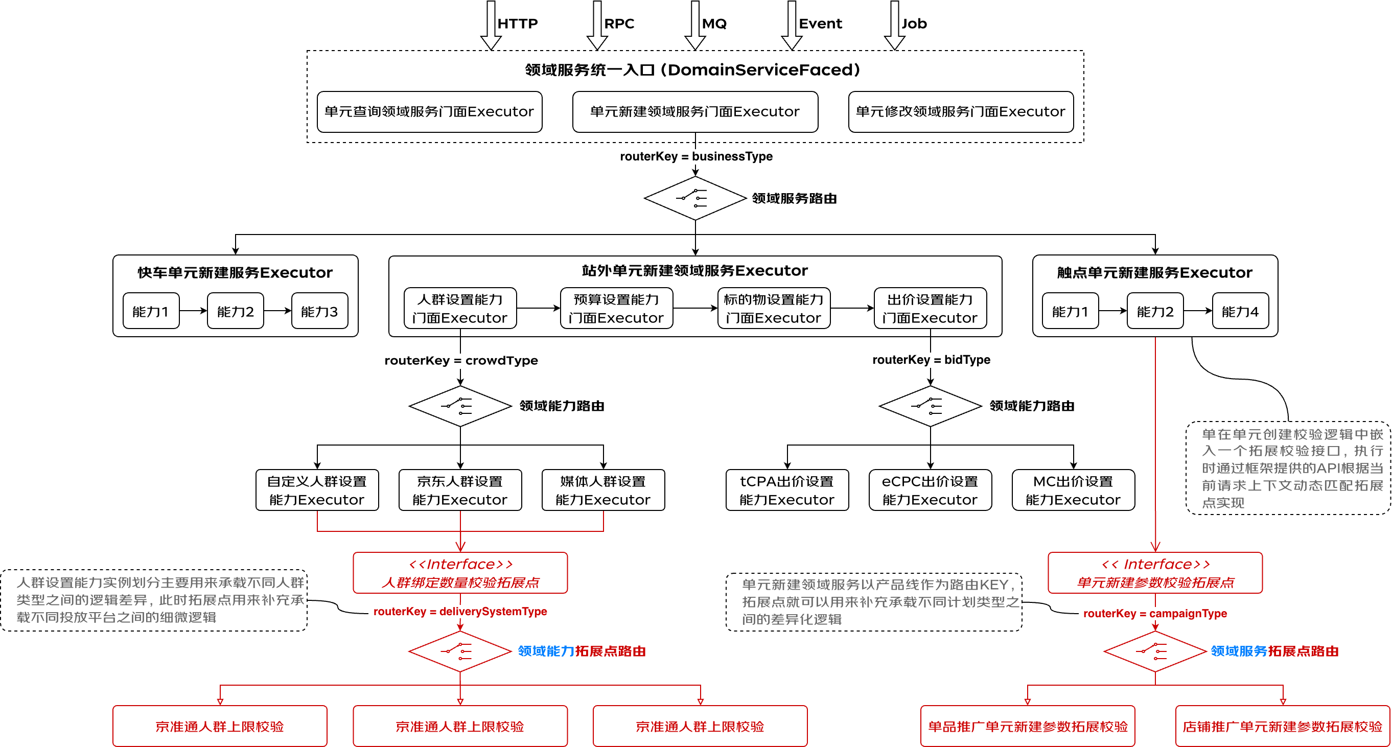 拓展点的作用是作为任意维度的差异点补充分离工具。需要注意的是在新架构中拓展点不是唯一的差异分离工具,在通用对象发现及路由机制下,领域服务、领域能力和拓展点都在不同维度上起着差异点分离的作用。相对与前两者拓展点更加灵活,通常用来承接领域服务及能力自身路由维度之外的逻辑差异。比如出价设置能力已经按照出价方式做了能力维度的差异分离,但是在相同的出价方式下,京准通与流量货币化还存在一些细微的逻辑差异,那么这个时候就可以在该能力实例中通过拓展点来补充实现平台维度的差异逻辑分离。
