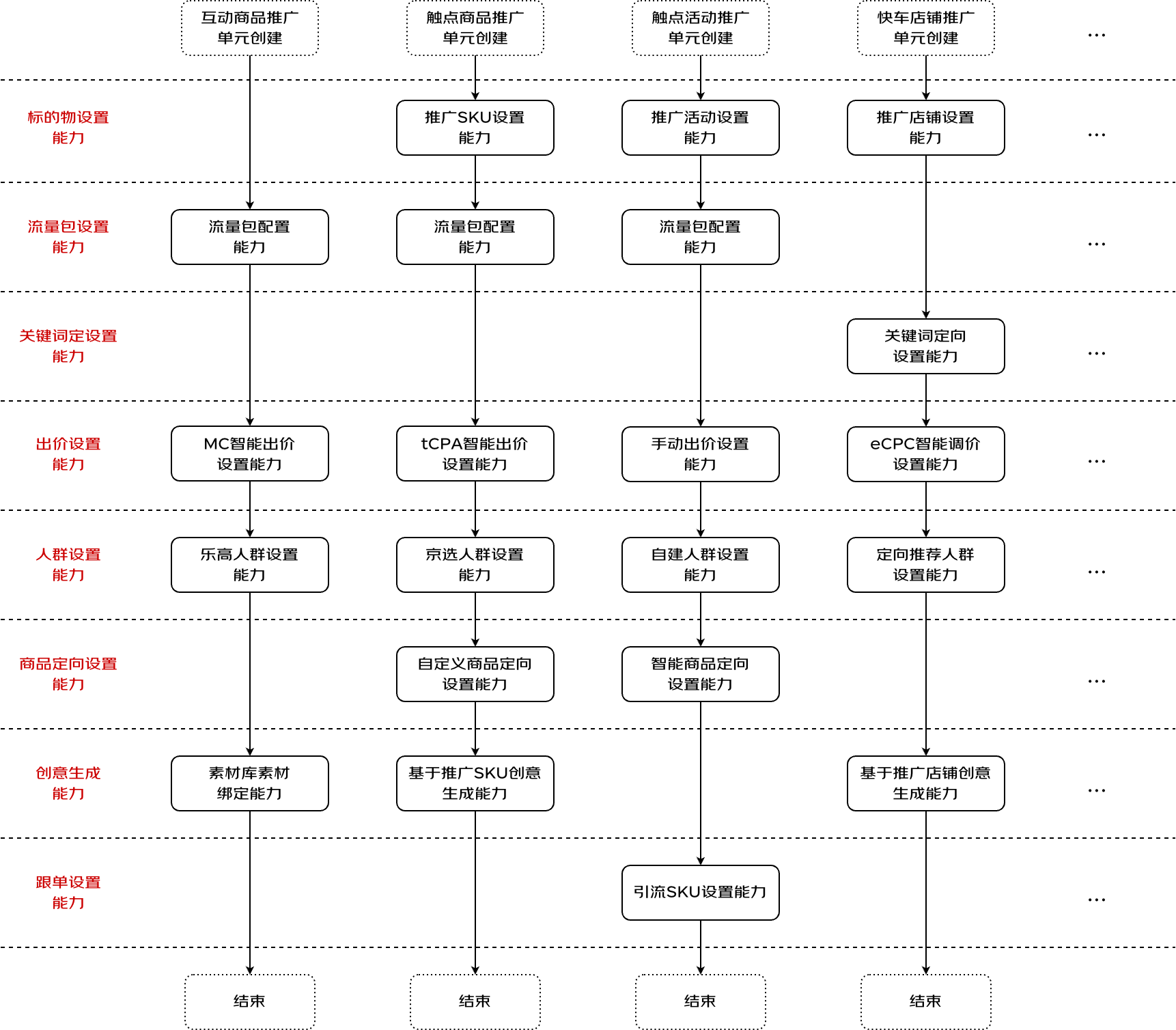 而在垂直方向上,早期的业务流程一般比较简短,只有少数几个业务环节。随着业务的发展,系统功能越来越丰富,业务流程也变得愈发冗长,开始呈现出鲜明的模块化特征。同样以广告投放系统为例,早期的广告物料只有时段、预算、出价、创意几个基础模块,随着业务的发展陆续新增了智能出价、人群定向、地域定向、商品定向、智能创意、智能选品等业务模块,物料创编流程也越来越冗长。除此之外,单个模块内部也开始出现多场景分化,如广告投放系统中的智能出价模块内部就存在tCPA、tROI、eCPC、MC等不同的智能出价模型,其数据模型及业务规则也不尽相同,这进一步增加了业务的复杂度。