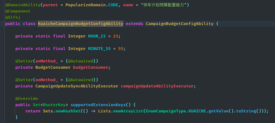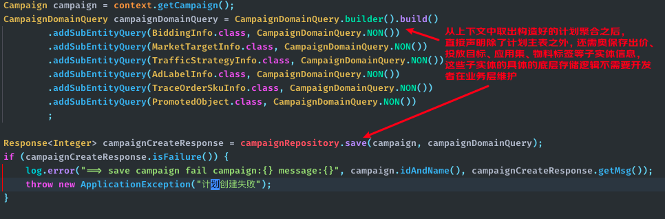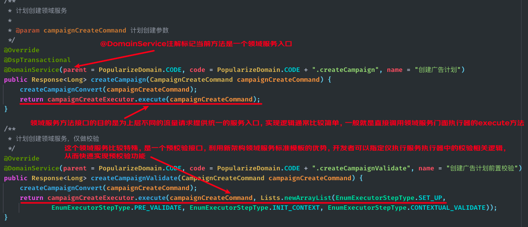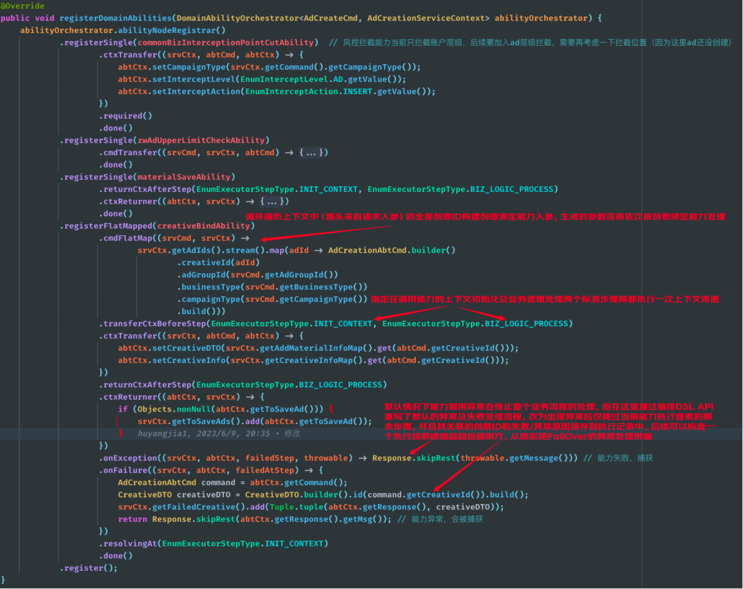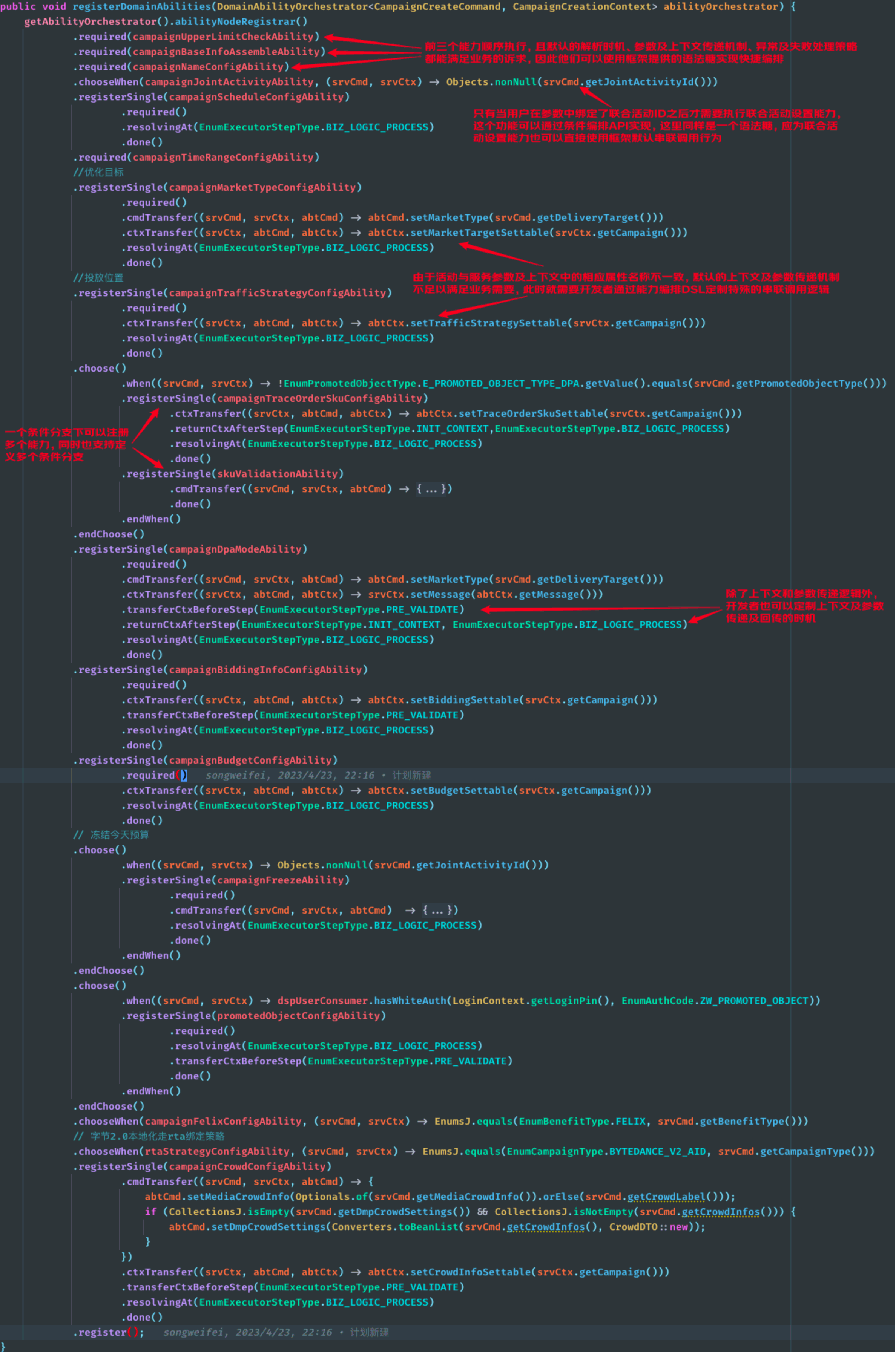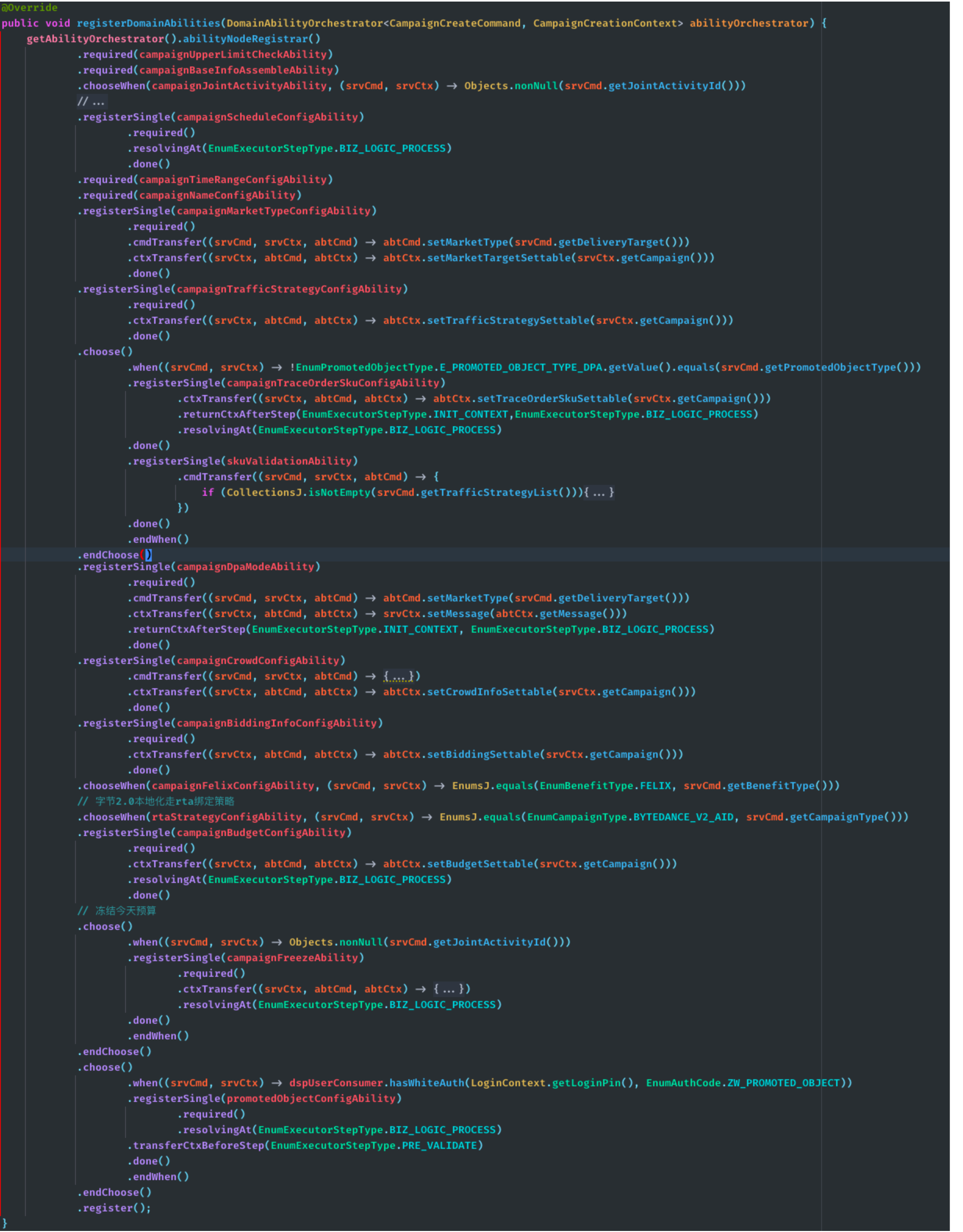 下图给出的是一个站外字节广告计划创建请求处理流程对应的领域能力执行图构建逻辑,可以看出能力编排DSL仅用数十行代码以一种近乎白话文形式描述出了完整的计划构建过程:首先对用户已创建计划数量进行上限检查(CampaignUpperLimitCheckAbility);上限校验通过后会构造出一个空的计划对象并为其填充用户ID、计划类型等基础信息(CampaignBaseInfoAssembleAbility);然后判断本次计划创建请求是否在参数中设置了联合活动ID,如果联合活动ID不为空则需要执行联合活动信息设置相关的业务逻辑(CampaignJointActivityAbility);完成联合活动信息设置之后就要依次设置计划的投放周期(CampaignScheduleConfigAbility)、计划名称(CampaignNameConfigAbility)、营销目标(CampaignMarketTypeConfigAbility)、应用集(TrafficStrategyConfigAbiliy)等模块的相关属性,需要注意的是在上述几个能力的编排逻辑中,由于领域能力的参数或上下文对象中的属性名称与领域服务的参数及上下文中相应属性并不匹配,默认的参数及上下文数据传递机制将无法为这几个属性设值,因此开发者对营销目标设置能力的参数传递(cmdTransfer)、上下文传递(ctxTransfer)、应用集设置能力的上下文传递(ctxTransfer)逻辑进行了自定义拓展,手动实现了参数及上下文中特殊属性的数据映射逻辑;在完成这些业务模块的属性设置之后,如果请求参数中设置的标的物类型为“商品库”,那么接下来就要执行与站外DPA广告业务相关的特殊业务环节:推广SKU的校验(SkuValidateAbility)以及SKU跟单信息的配置(TraceOrderSkuConfigAbility)逻辑......