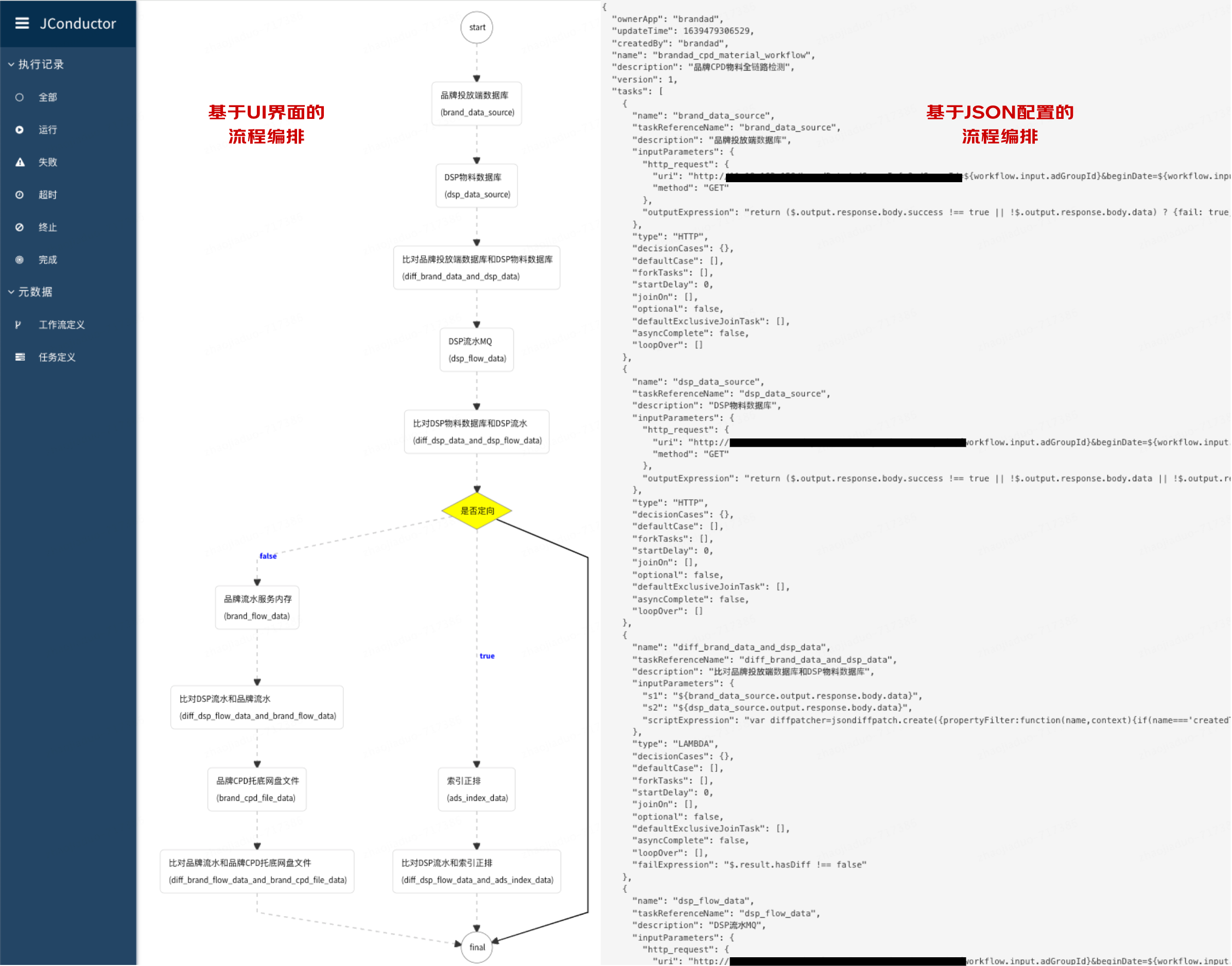 尽管我们在PICASO框架中舍弃了图形化流程编排框架的设计,但是我们并没有否定它存在的意义,这种编排方式在低代码编程领域占有重要的地位。但是它更适合在一些节点类型有限或者流程相对稳定的业务场景下使用,比如审批流程,虽然审批流可能有很多,但是每个审批流程中的节点种类往往不多,可以用相对固定的模式进行串联;或者广告播放流程,尽管其业务流程同样节点众多、冗长复杂,但是流程数量相对固定,基本上可以分为展示、搜索、推荐、站外、合约这五大核心流程,很多变更是对流程的微调或节点内部的逻辑升级。与这些业务相比,广告投放系统则维护了近300个能力节点、400多条请求处理流程,每次需求迭代都会涉及数十条业务流程的变更。在这样的业务特点下, 简洁、灵活、集中、连贯的开发体验要比一个炫酷的UI交互界面重要的多 。当然,我们依然十分认可图形化界面强大的呈现能力,事实上我们也在规划为PICASO框架开发内置的 代码元数据管理平台 ,其中一项重要的功能就是把代码中基于能力编排DSL构建出来的领域能力执行图解析为业务流程图回显到交互界面中,让开发者可以直观地查看所有领域服务的处理流程。但是该平台只做能力编排逻辑的图形化展示,领域能力执行图的构造依然是通过代码中的能力编排API实现的(当然该平台也可以提供各个能力编排节点配置属性的动态修改功能,但是这仅作为紧急情况下的应急处理措施)。