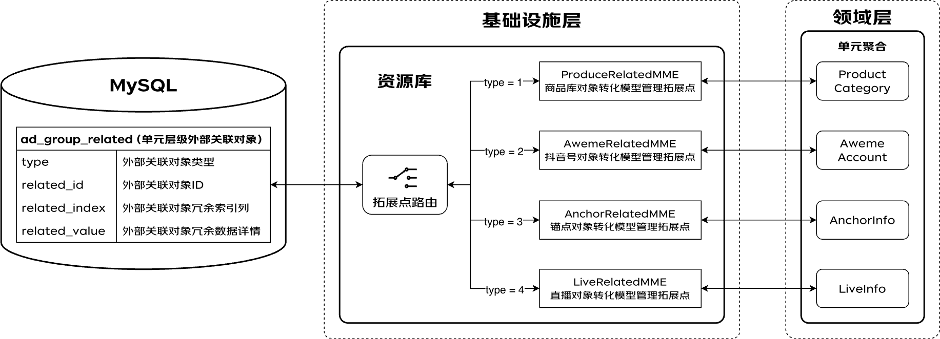 下图给出了一个广告投放业务中聚合实体与底层库表结构设计的例子,投放系统作为一个业务集成平台需要不断地对接各种垂直业务系统,在广告物料中也需要不断集成各类业务实体,这些数据也需要保存到底层的广告物料数据中。在设计单元聚合时,我们会紧贴业务实际为各类外部关联对象定义含义明确的聚合实体:商品库(ProductCategory)、抖音账号信息(AweneAccount)、展示锚点信息(AnchorInfo)、直播信息(LiveInfo)等,从而确保领域模型与实际业务的统一。但是在设计底层库表结构时为了避免库表结构膨胀以及表字段稀疏化,我们采用了通用化的存储结构:绑定到广告物料上的不同外部业务对象都保存到同一张外部关联对象表中,该表中的字段采用泛化设计,不与任何一种特定的外部业务对象相绑定,而是通过type字段确定本条记录对应的外部对象类型以及表中其他字段的实际业务含义,业务层对这些外部业务对象读写操作都要通过资源库集中维护的底层数据记录与领域层聚合实体之间的映射逻辑做转换。需要特别说明的是,在新架构中我们将PICASO框架中的拓展点机制延伸到了基础设施层,引入了模型管理拓展点(Model Manage Extension, MME)来实现聚合组装主流程与底层数据对象转换逻辑的解耦。在本例中,我们将外部关联对象表对应的PO对象与领域层聚合实体之间的映射逻辑抽离成了一个模型管理拓展点,以外部关联对象类型作为路由键,通过PICASO框架的通用可执行实体发现与路由机制实现具体拓展点实现的自动定位。可以看出资源库的存在不仅让开发者可以聚焦业务实际设计领域模型,让代码直接反映业务实际,同时还让通用化的底层数据存储结构得到更加广泛的应:库表结构的通用化设计虽然能够解决数据库模型膨胀的问题,但是也的确降低了数据模型对业务的表达能力,而且如果让上层业务直接操作这些库表,势必会造成代码逻辑不明、编码繁琐的问题。然而资源库却通过收口底层数据对象与上层业务实体之间的转化逻辑很好地解决了这些问题,让我们在采纳这种通用化的数据存储结构设计时少了很多顾虑。