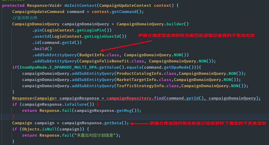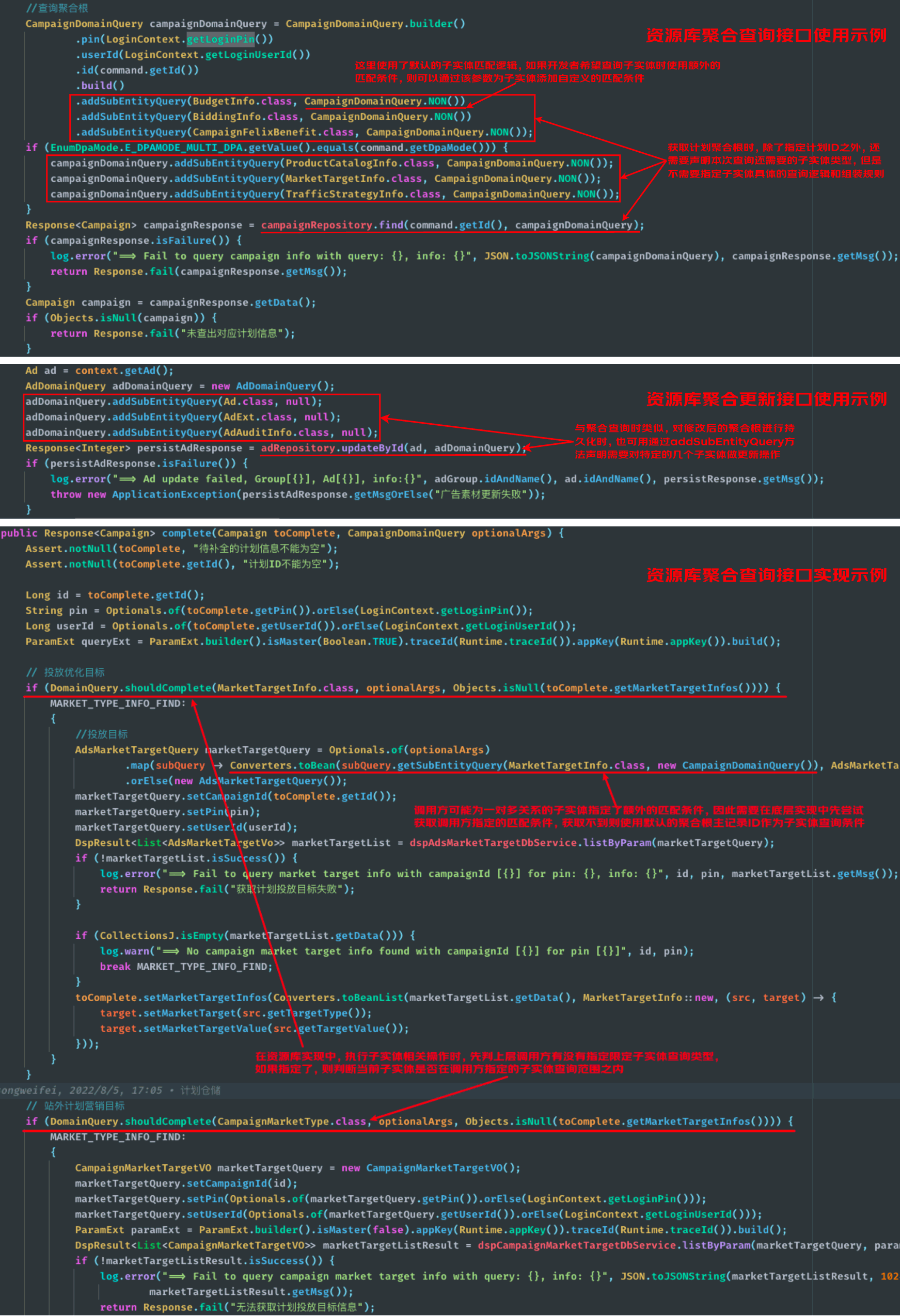 在《能力编排领域特定语言》章节中我们已经对声明式编程有了比较具象的体会,但声明式编程并不限定于领域特定语言这一种实现形式,在资源库的接口设计上我们采用了一种更加朴素的声明式编程实现方法。如下图所示,我们计划聚合的查询以及创意聚合的更新接口为例来阐述声明式数据操作的设计细节。当需要从资源库中获取聚合根对象时,默认情况下资源库库会自动查询聚合下所有子实体并完成组装,但是开发者可以再提供一个额外的辅助查询参数DomainQuery,并通过该对象的addSubEntityQuery方法声明希望获取哪些特定的子实体。默认情况下资源库会根据聚合根对应的主表记录ID做子实体查询,如果开发者希望在子实体查询时使用额外的匹配条件,则可以通过addSubEntityQuery方法同时声明希望获取的子实体类型以及执行该类型子实体查询时使用的额外匹配参数,这一特性在与聚合根存在一对多的子实体查询场景中会发挥重要作用。上述声明式接口在资源库实现中并不复杂,只需要在执行每个子实体的查询或修改操作之前,判断一下上层调用方是否限定了仅对部分子实体进行操作,如果设置了则进一步判断当前子实体是否在上层调用方指定的子实体范围之内,如果当前子实体业务上允许调用方指定自定义的匹配逻辑,还需要尝试从辅助查询/修改参数中提取调用方为该子实体指定的自定义匹配逻辑。需要特别说明的是,我们不推荐在新架构内部各个模块之间采用任何形式的黑盒调用模式,不管是能力编排还是资源库调用,上层调用方都有责任和义务理清底层模块的内部执行逻辑,确保编排配置或调用参数设置正确。