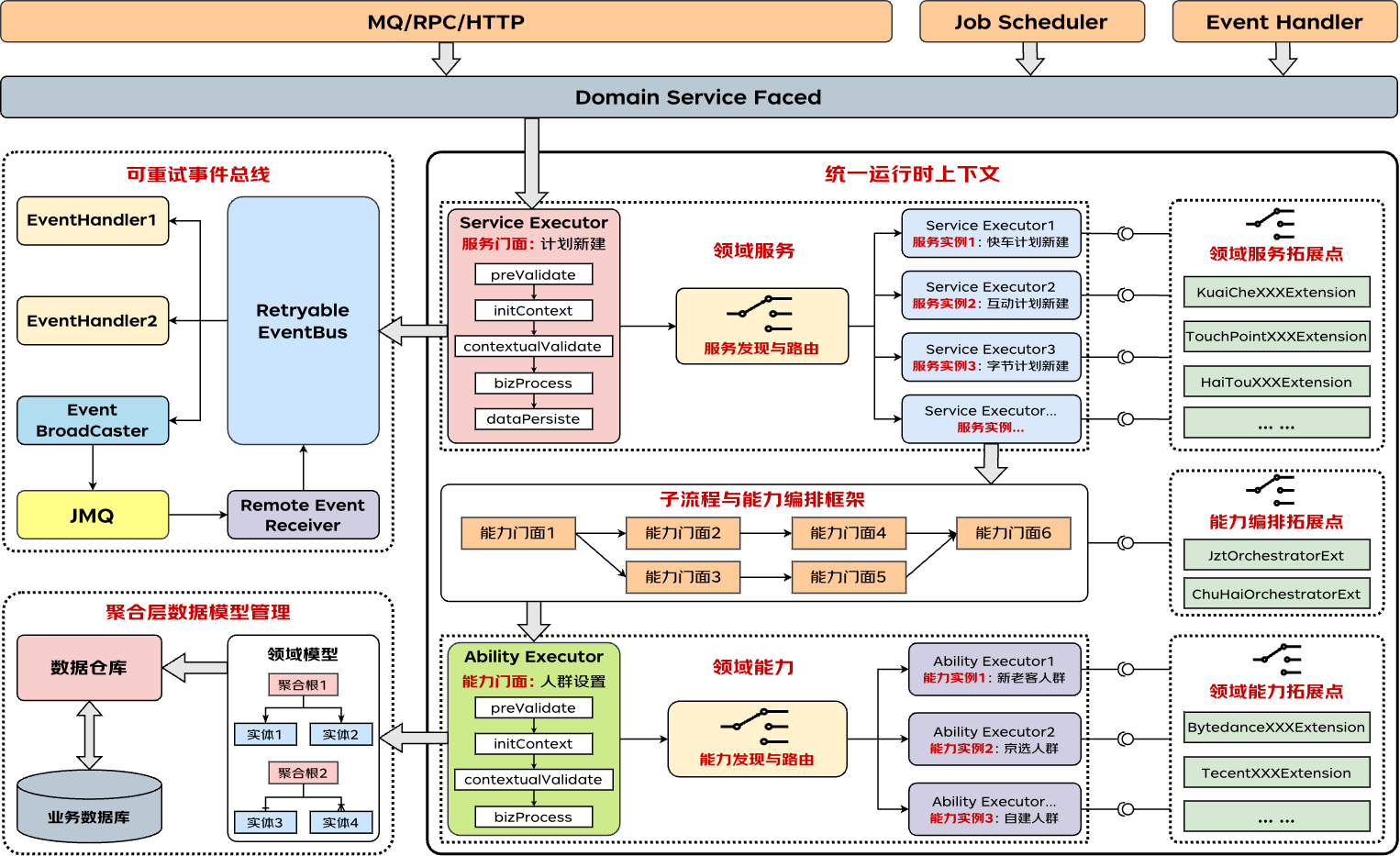 领域服务统一入口(Domain Service Faced)的作用是为HTTP、RPC、MQ等上层不同的请求流量暴露统一的服务入口。他将同一个业务子域内领域服务执行器集中到一起,便于流量介入层调用,同时也可以集中进行方法性能监控、调用量统计、请求日志记录等通用功能。