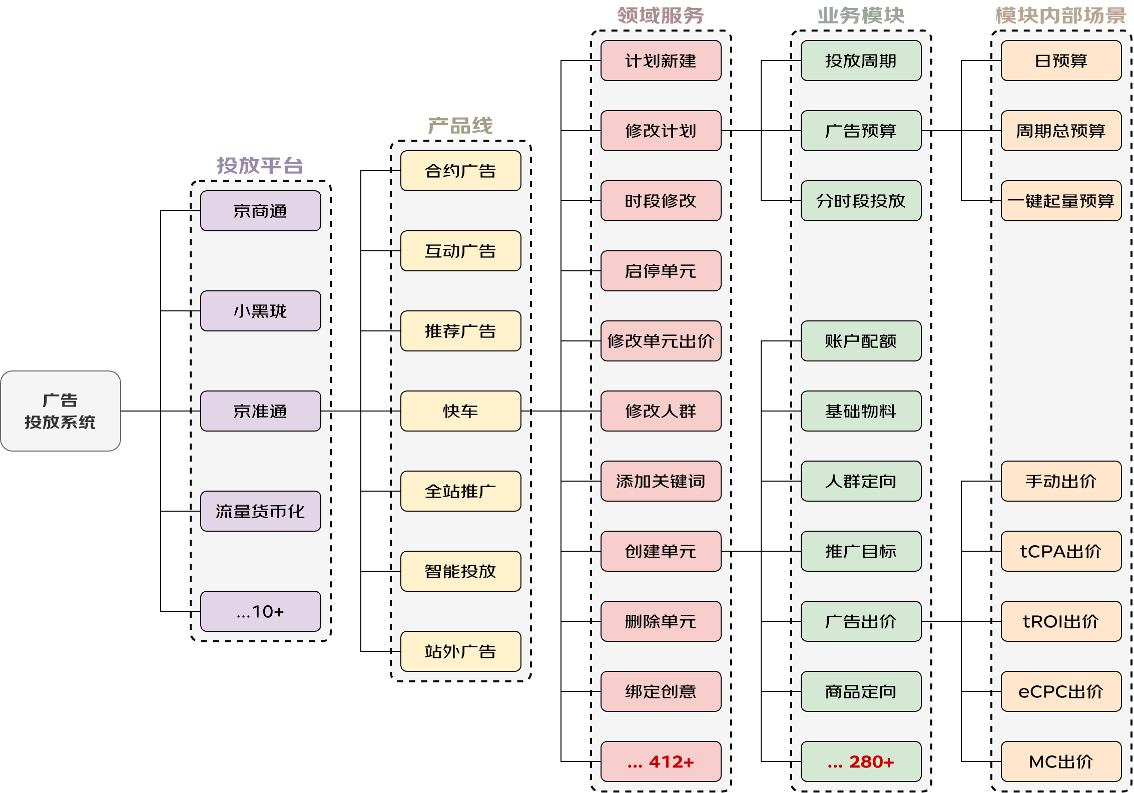 业务发展的早期往往都是单一场景,随着业务的发展,产品形态开始变得丰富多样,服务的用户及业务方也越来越多,业务架构从原来的单点结构逐渐演变为复杂的树状结构,树的每一层都代表一个业务维度,业务的发展让系统在水平方向上呈现出多维度增长的特征。以广告投放系统为例,最初的投放系统只有合约展示包段一种业务形态,随着程序化广告和智能广告的兴起,广告投放及播放形式层出不穷,业务树中开始出现“产品线”的维度;而为了服务不同业务方,我们在系统中增加了“投放平台”的维度;对不同投放标的物的支持又在系统中引入了“计划类型”的维度......就这样广告投放系统的业务架构也逐渐演变成了如下图所示的复杂树状结构。
