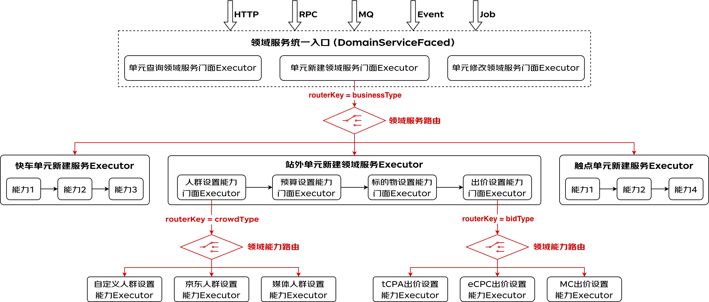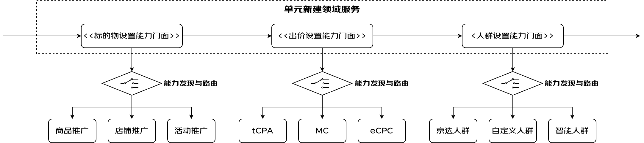 只是把业务流程按照功能边界拆分成不同的模块通常是不够的,因为单个模块内部往往还存在细分的业务模式,如上图中的出价设置模块,其内部还存在手动、MC、tCPA、eCPC等不同的出价模型,这个时候就需要根据分类思想进行进一步拆解。分类思想是关注点分离思想进一步的延伸,它在分离的同时还注重元素之间的共性特征。当模块内部出现场景分化时,PICASO框架建议开发者对模块进行进一步细分,将模块内不同场景的业务规则封装为不同的能力实例。这些能力实例之间尽管存在逻辑差异,但是毕竟属于同一个原子业务模块,在数据模型、接口协议乃至业务流程上都存在很大的相似度。因此PICASO会将同模块下不同业务场景对应的领域能力实例聚合到一起,这样的一组能力被称为一个能力节点。同一个能力节点下的各个能力实例使用相同的接口参数及上下文定义,每个能力节点下会额外定义一个能力门面,能力门面通常不承载具体的业务规则,它仅负责定义当前能力节点对外的接口协议以及从请求参数中提取业务场景标识的逻辑,它是能力节点下所有能力实例对外提供服务的统一入口。上层的领域服务组合领域能力时,引用的不是具体的领域能力实例,而是各个能力节点下的能力门面。PICASO框架内置的可执行实体发现与路由机制会在应用启动时扫描出系统中所有的能力门面,并建立好能力门面与各个能力实例的路由表。当请求到来时,领域服务不必关注本次请求应该使用哪个具体的能力实例,而是直接调用能力门面的统一入口,PICASO框架会通过内置的可执行实体发现与路由机制提取请求中的场景标识,然后将请求路由到对应的领域能力实例上,从而实现模块内部的场景复杂度与领域服务模块集成复杂度之间的解耦。以出价模块为例,出价模块内部会根据不同的出价类型细分为tCPA、MC、eCPC等智能出价能力实例,但是单元新建领域服务并不会直接操作这些具体的能力实例,它引用是出价设置能力门面。当请求到来时,PICASO框架会根据请求中的出价类型自动将请求路由到相应的能力实例上。可执行实体发现与路由机制是PICASO框架内置的一个底层通用组件,是能力编排、拓展点机制等顶层功能的基础。其本质上就是一个增强型的门面+策略模式,我们通过一些实现技巧将其做成了一个可以适配任意可执行实体的通用组件。如下图所示,单元新建业务流程涉及标的物设置、出价设置及人群设置等业务环节,这些业务环节内部都有各自的细分场景。在代码实现中,这些业务环节被抽象为3个能力节点,节点内部的细分场景被隔离到不同的能力实例中,在构建领域服务时就不需要考虑当前各个能力节点下的细分逻辑,只需要专注于业务流程本身,实现各个能力门面的组装逻辑即可。