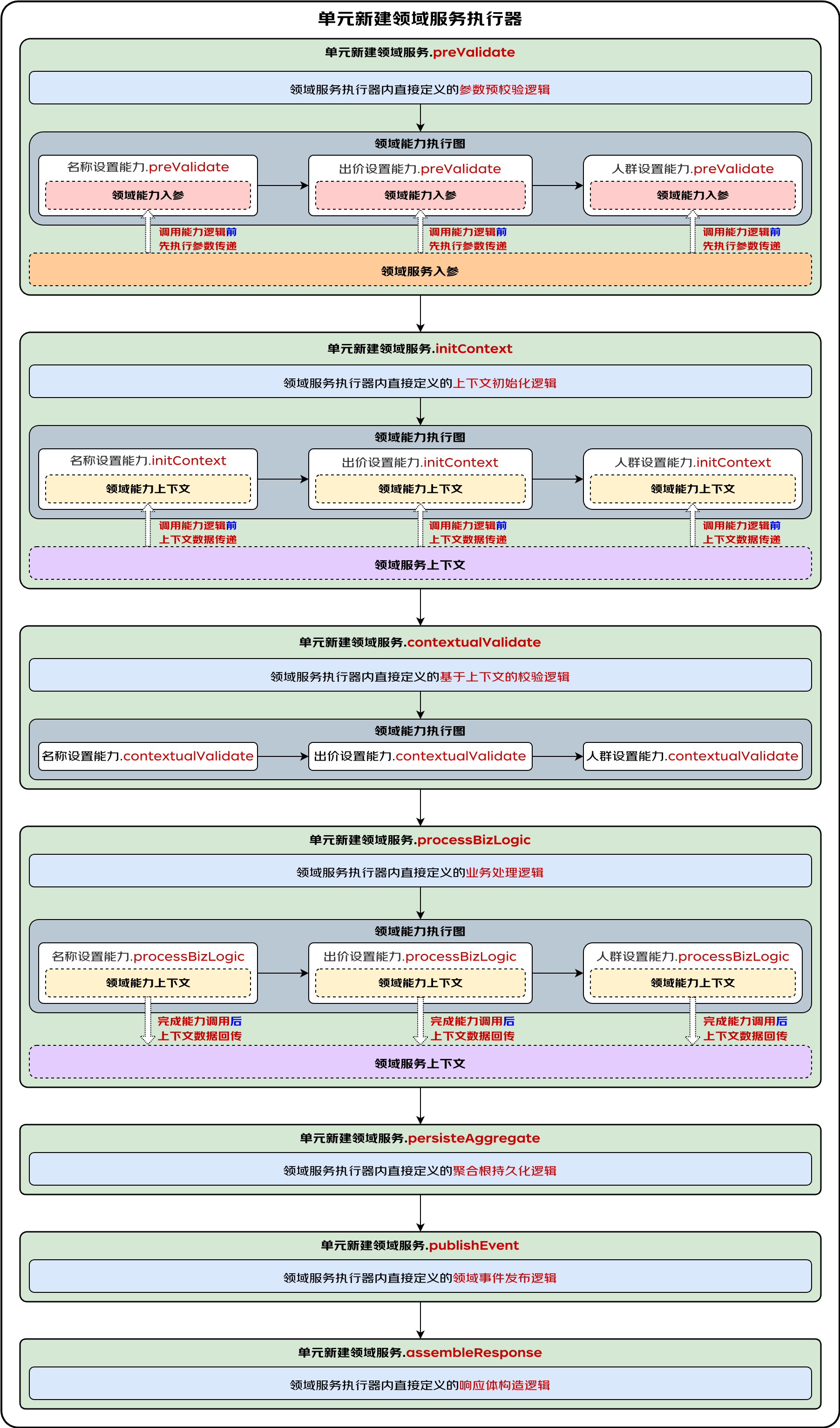 由于标准业务执行器中的剩余的几个标准步骤承载的都是请求维度的逻辑,领域能力执行器标准模版中对这几个方法也做了屏蔽,因此在这几个标准步骤的执行流程中就不需要再调用领域能力执行图了。需要特别说明的是,当执行到聚合根持久化标准步骤时,定义在领域服务及领域能力中的业务规则对实体的变更以及构建出的新业务实体都已经写入到了上下文中,开发者可以充分利用领域服务对数据操作全局把控的职责定位,积极采用批量、异步、并行等手段进行极致地性能优化。