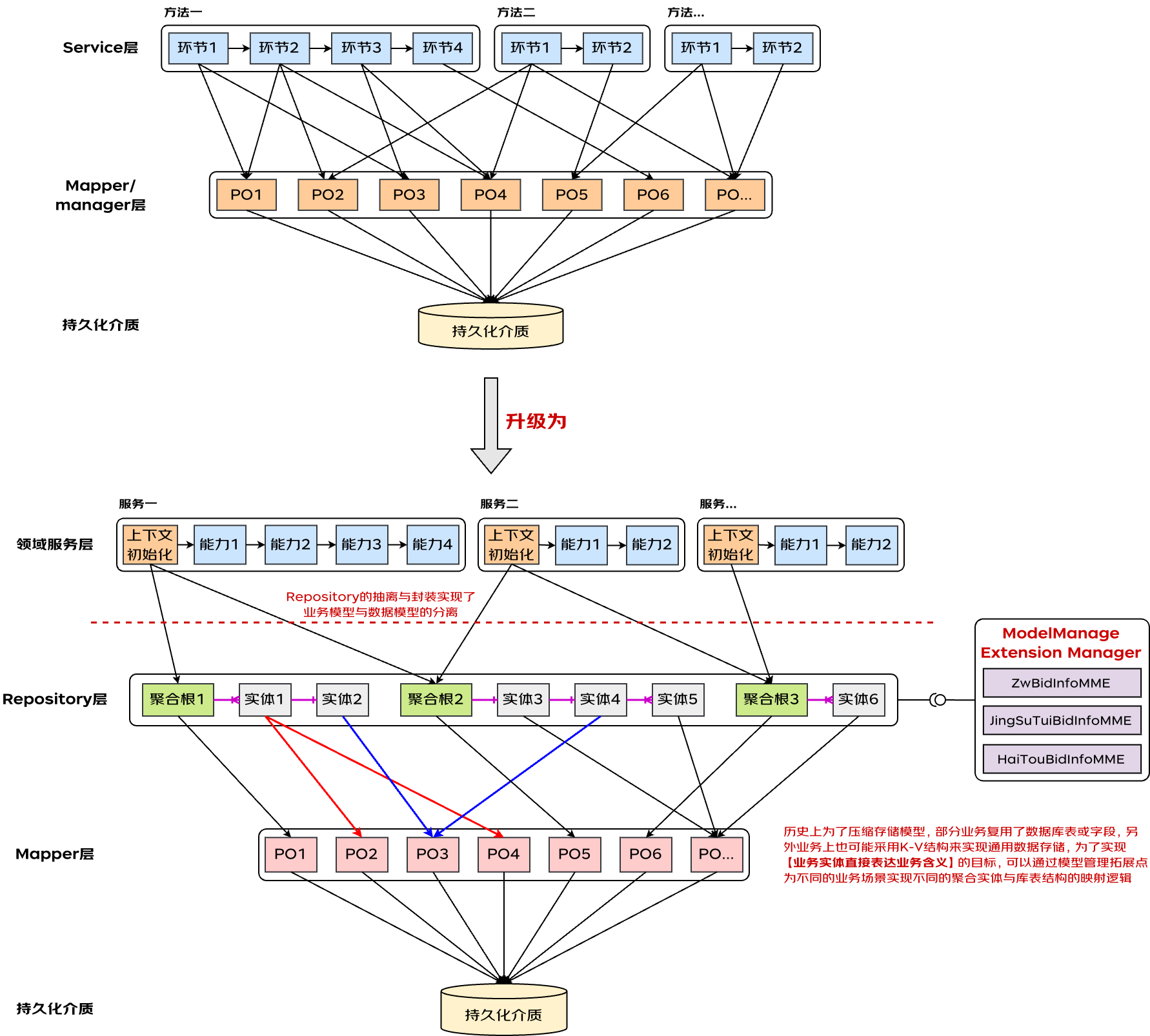 底层通用化存储结构(K-V模式)在资源库中通过模型管理拓展点被映射为领域模型中业务含义明确的实体对象