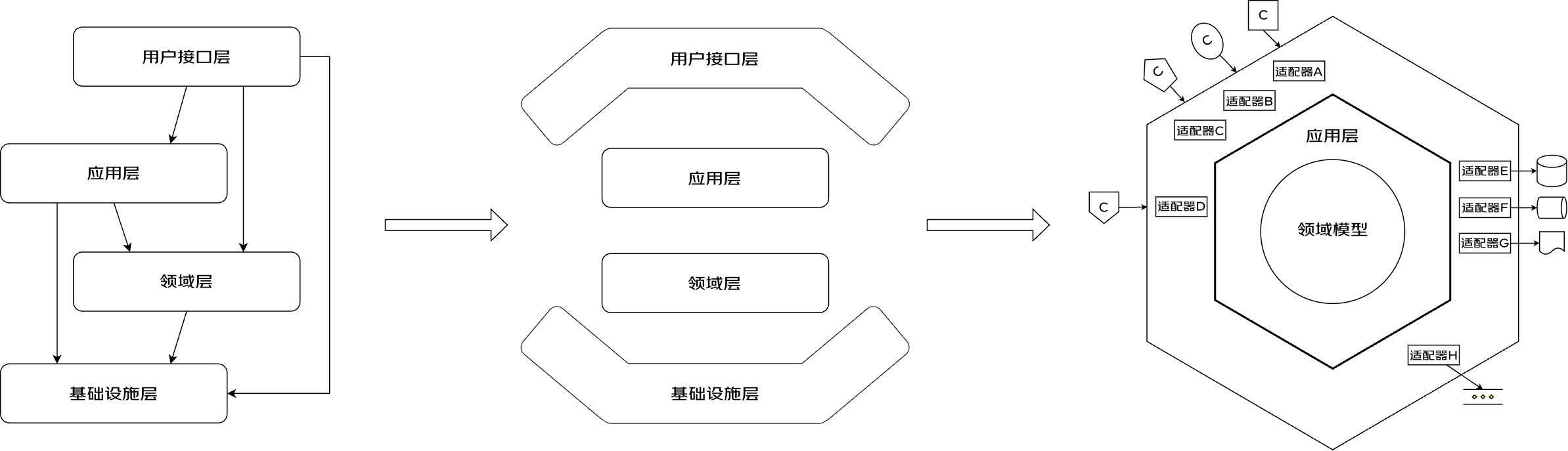六边形架构实际上是在分层架构的基础上升级而来。领域驱动设计思想作为一种设计的指导思想其实并不会限制使用某种特定的架构,在传统的分层架构上也可以实现领域驱动设计思想的落地。下图中最左侧给出了应用了领域驱动设计思想之后的分层架构,它看上去就是将传统三层架构中的业务层拆分为应用层与领域层。其中领域层负责维护领域模型,所谓的领域模型就是由当前领域内的全部聚合、资源库以及运行在这些聚合实体上领域能力和领域服务构成的;应用层则从业务视角定义了系统应该对外提供多少服务(也就是所谓用例(use case)和用户故事(user story),如果你特别执着于那些术语的话),这些服务接口最终都会调用领域层中的领域服务执行器来实现接口功能;应用层关注的是在系统应该对外提供哪些服务,但是并不关心这些服务的请求来源是RPC调用还是MQ通知,这是用户接口层的职责,它负责根据与调用方达成的约定将应用层接口暴露给不同的接口协议:Http、RPC、MQ、事件通知等等;基础设施层则负责维护系统中使用的众多中间件、工具以及底层存储介质的访问逻辑。