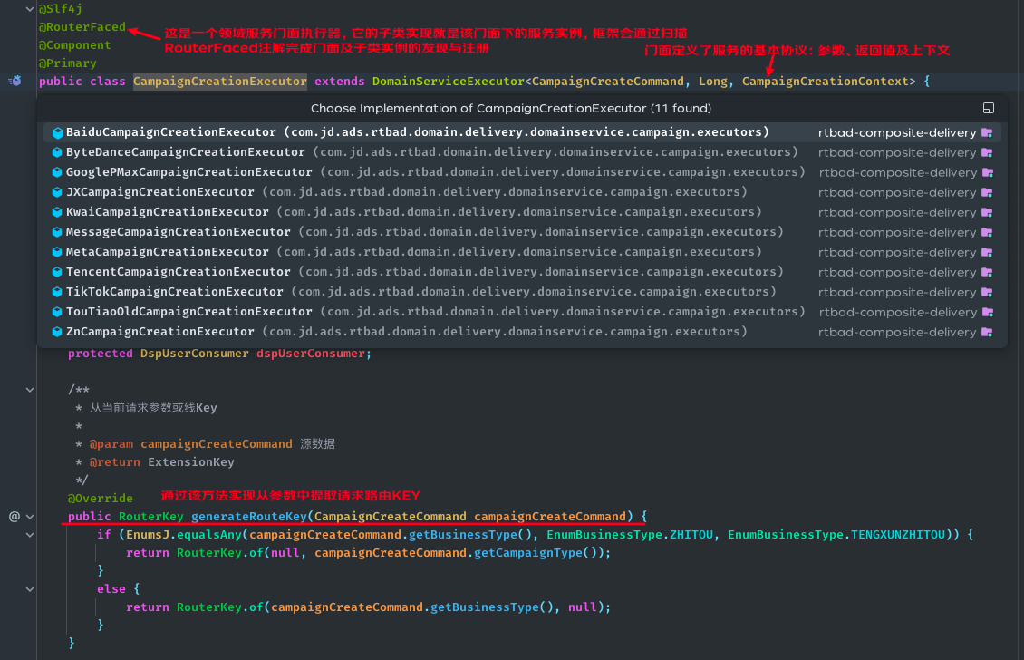 领域服务统一入口引用的是各个领域服务门面执行器,它负责从参数中提取业务标识并定位到具体的领域服务实例。如下图所示,所有具体的领域服务实例都继承自领域服务门面执行器,请求到来时领域服务门面先通过generateRouteKey方法从当前参数中提取出本次请求的业务标识,然后与各个领域服务实例能够支持的业务标识做匹配,从而定位到应该处理本次请求的服务实例。